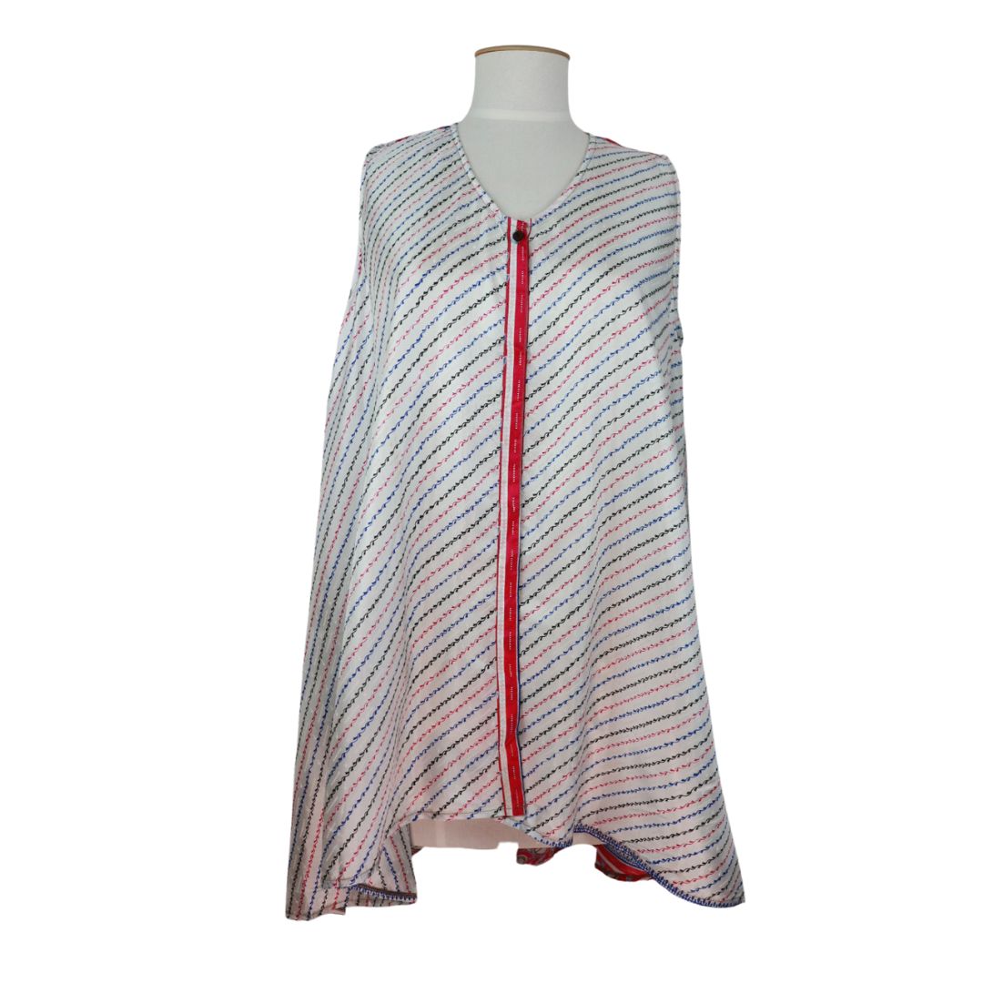 Add colour to your wardrobe with a unique piece to layer with. This sleeveless top / waistcoat has a single button to fasten it allowing the garment to float with you. Made from recycled saris.