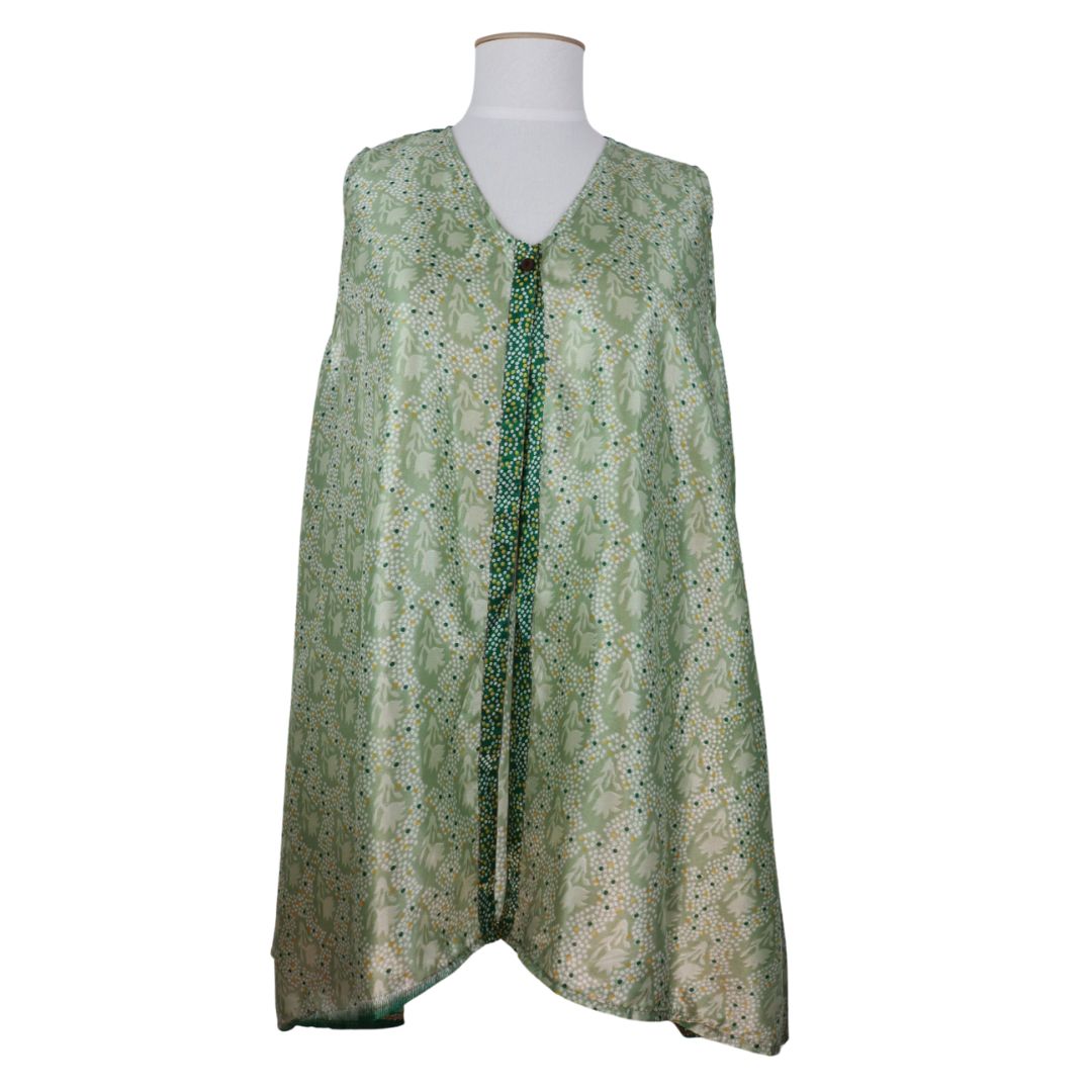 Add colour to your wardrobe with a unique piece to layer with. This sleeveless top / waistcoat has a single button to fasten it allowing the garment to float with you. Made from recycled saris.