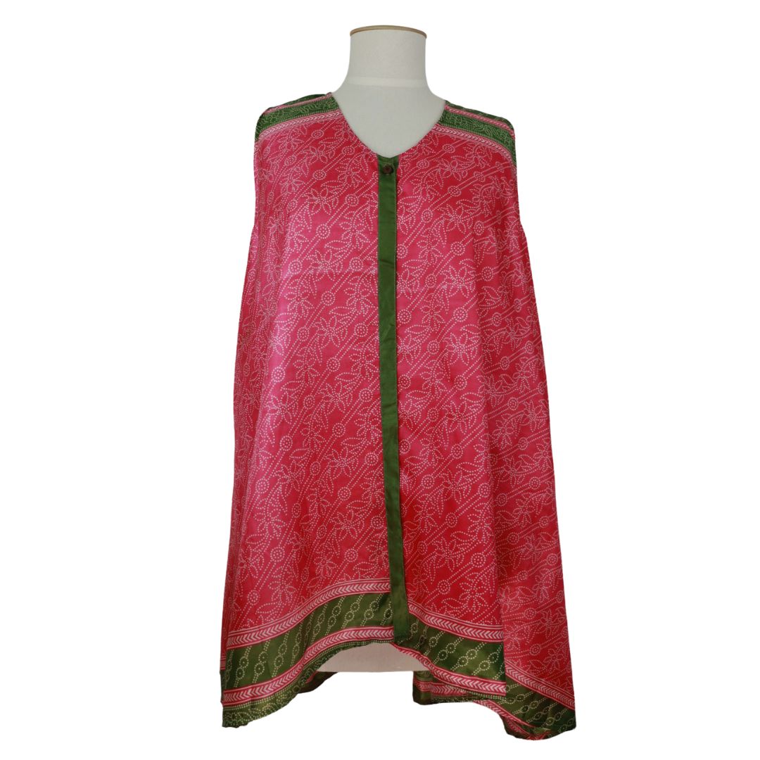 Add colour to your wardrobe with a unique piece to layer with. This sleeveless top / waistcoat has a single button to fasten it allowing the garment to float with you. Made from recycled saris.