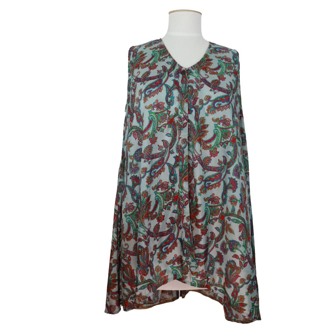 Add colour to your wardrobe with a unique piece to layer with. This sleeveless top / waistcoat has a single button to fasten it allowing the garment to float with you. Made from recycled saris.