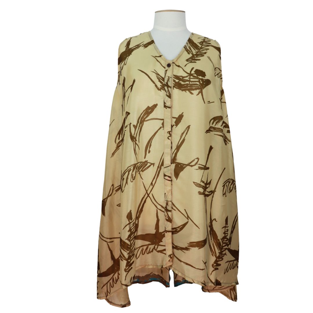 Add colour to your wardrobe with a unique piece to layer with. This sleeveless top / waistcoat has a single button to fasten it allowing the garment to float with you. Made from recycled saris.