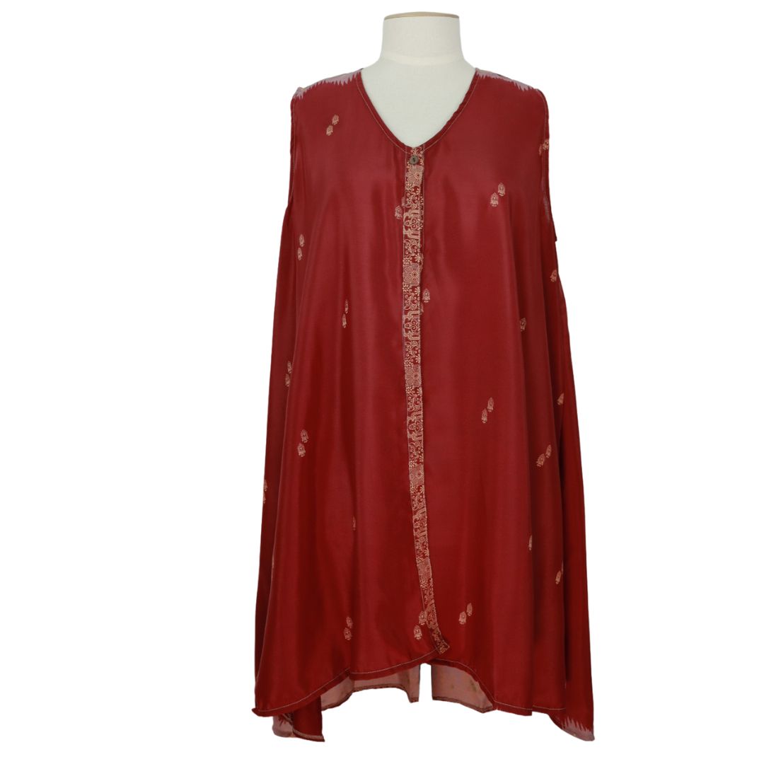 Add colour to your wardrobe with a unique piece to layer with. This sleeveless top / waistcoat has a single button to fasten it allowing the garment to float with you. Made from recycled saris.