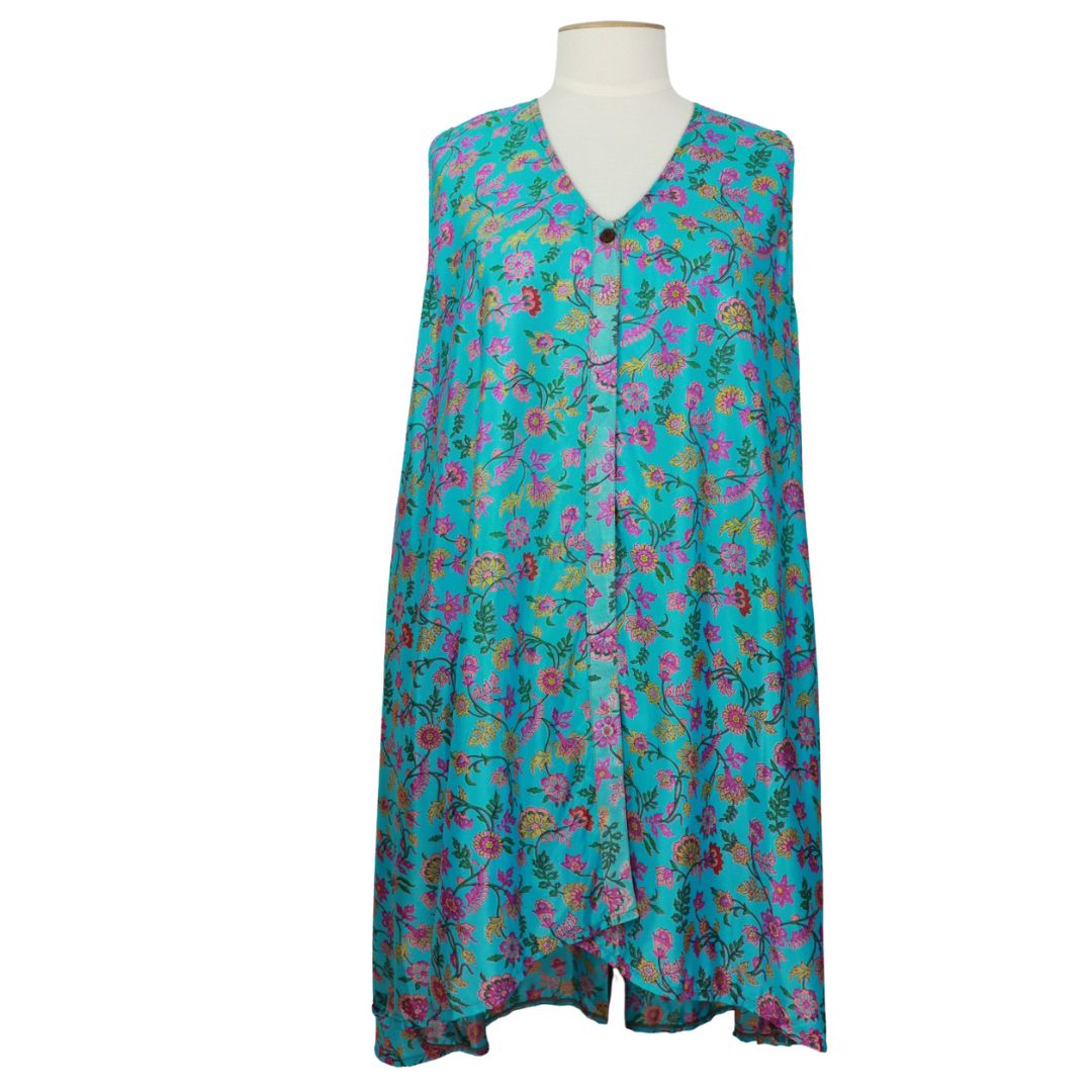 Add colour to your wardrobe with a unique piece to layer with. This sleeveless top / waistcoat has a single button to fasten it allowing the garment to float with you. Made from recycled saris.