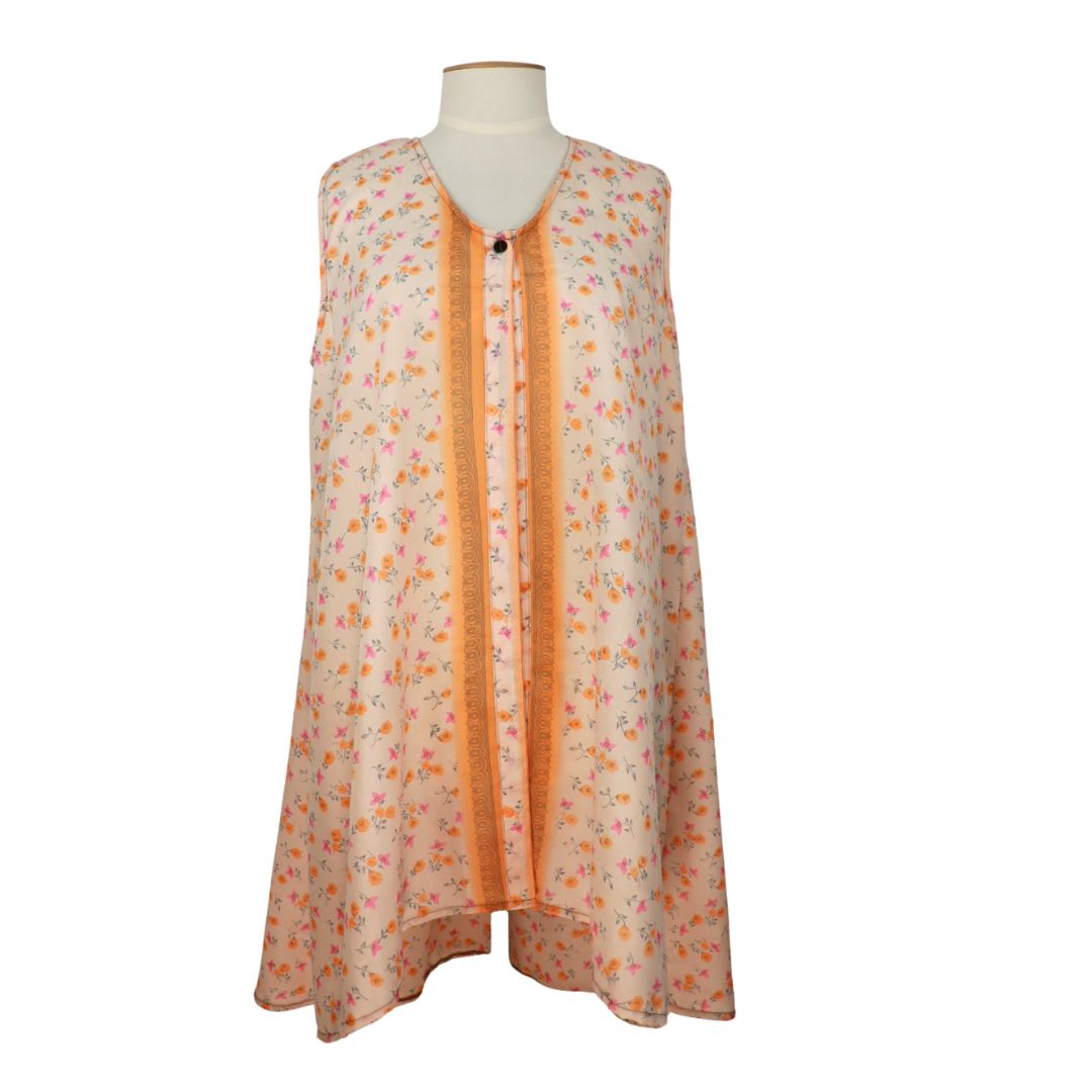 Add colour to your wardrobe with a unique piece to layer with. This sleeveless top / waistcoat has a single button to fasten it allowing the garment to float with you. Made from recycled saris.