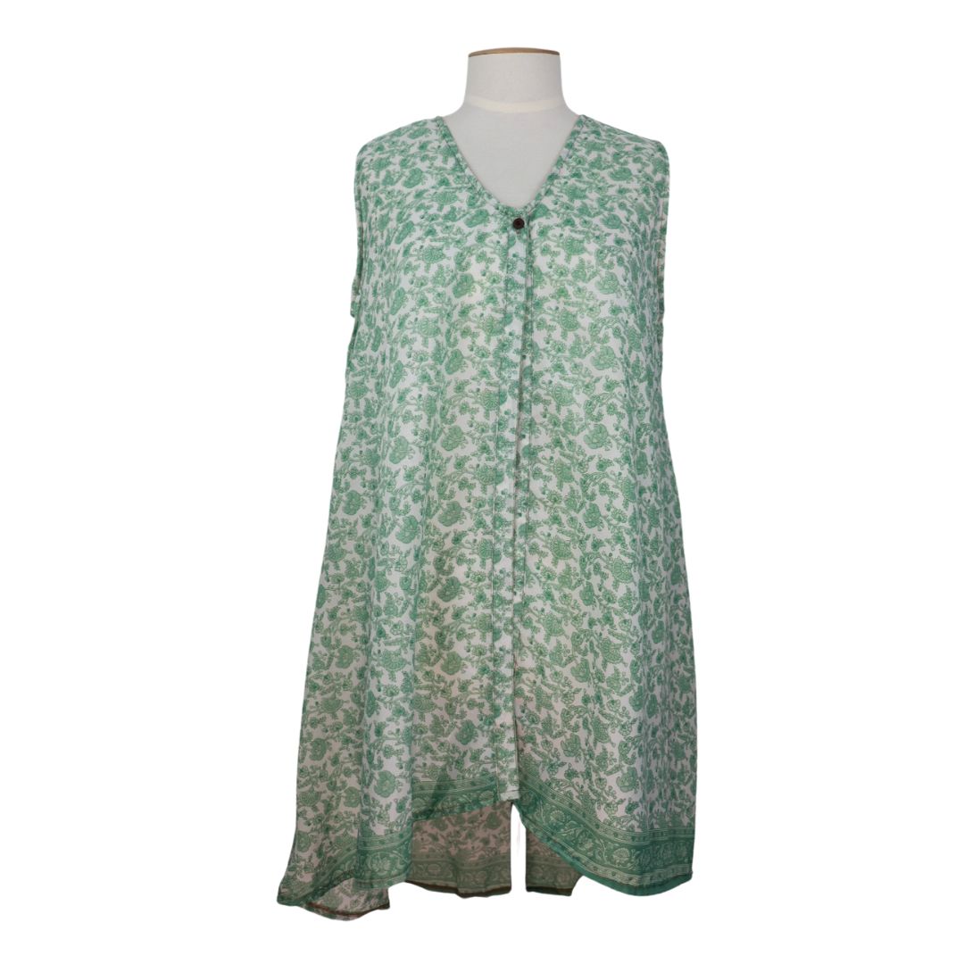 Add colour to your wardrobe with a unique piece to layer with. This sleeveless top / waistcoat has a single button to fasten it allowing the garment to float with you. Made from recycled saris.