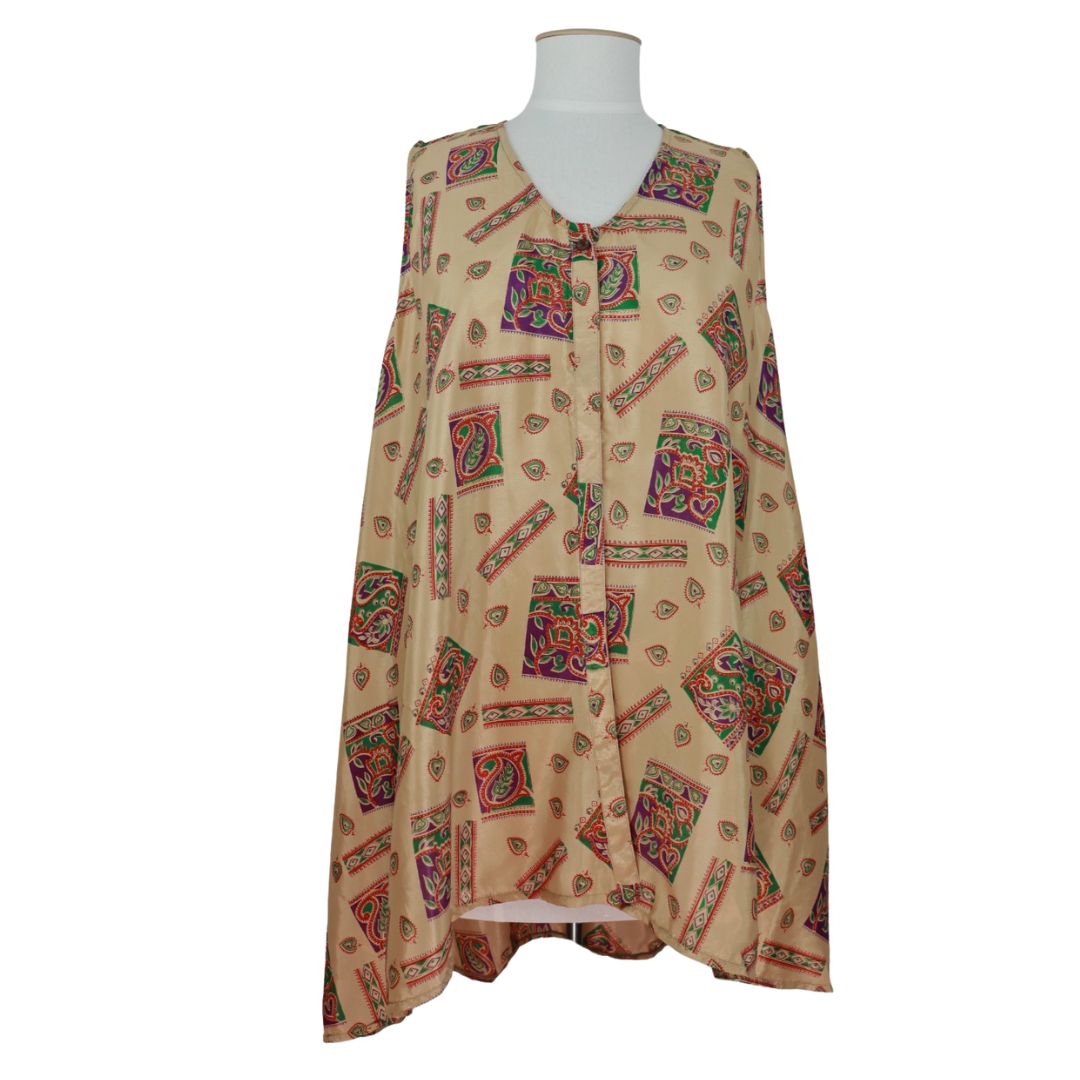 Add colour to your wardrobe with a unique piece to layer with. This sleeveless top / waistcoat has a single button to fasten it allowing the garment to float with you. Made from recycled saris.