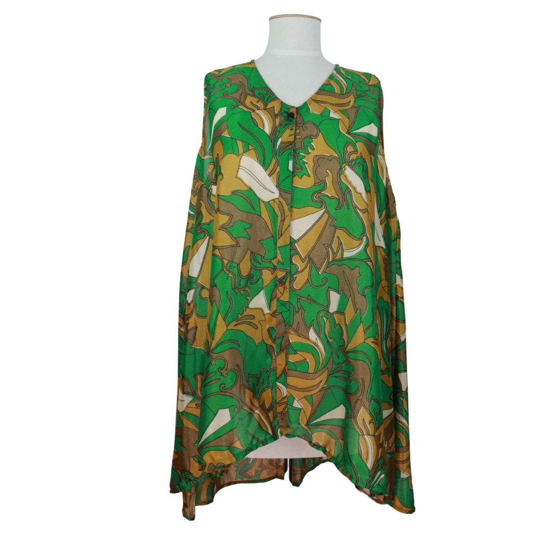 Add colour to your wardrobe with a unique piece to layer with. This sleeveless top / waistcoat has a single button to fasten it allowing the garment to float with you. Made from recycled saris.