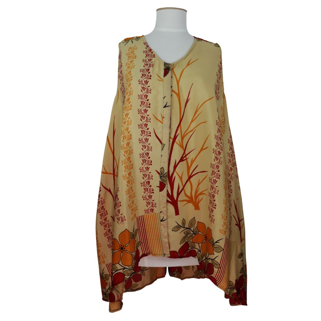 Add colour to your wardrobe with a unique piece to layer with. This sleeveless top / waistcoat has a single button to fasten it allowing the garment to float with you. Made from recycled saris.