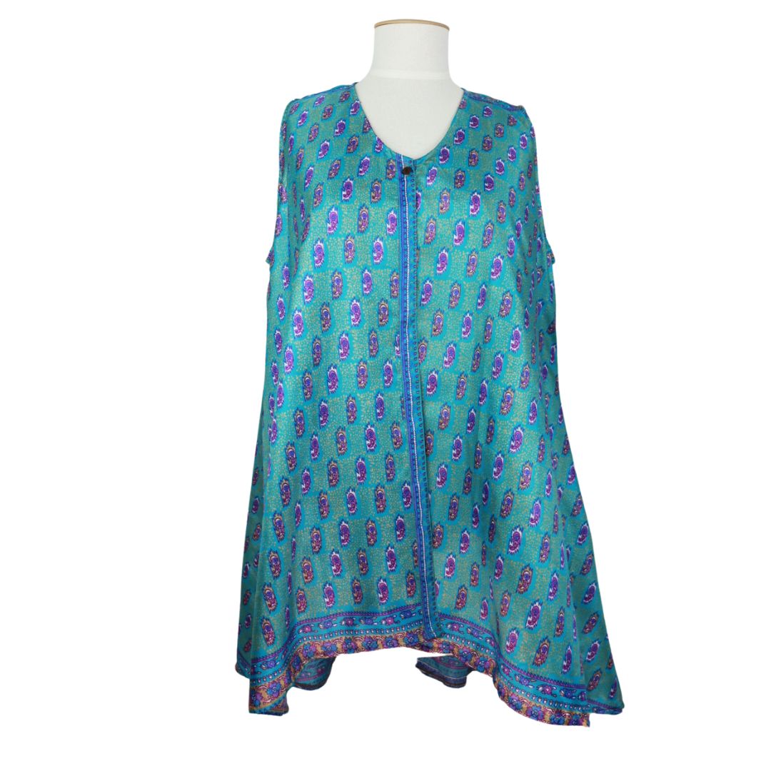 Add colour to your wardrobe with a unique piece to layer with. This sleeveless top / waistcoat has a single button to fasten it allowing the garment to float with you. Made from recycled saris.