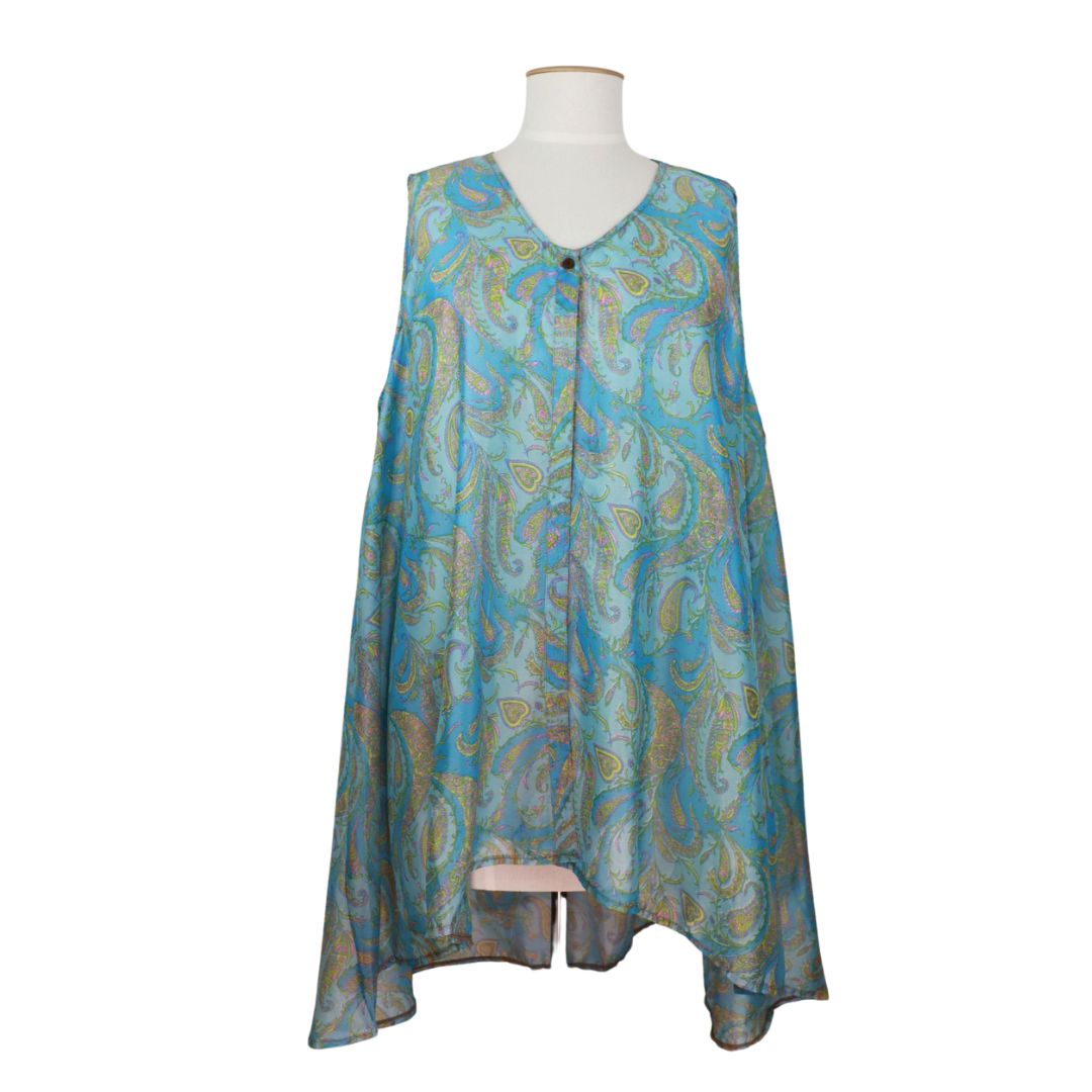 Add colour to your wardrobe with a unique piece to layer with. This sleeveless top / waistcoat has a single button to fasten it allowing the garment to float with you. Made from recycled saris.