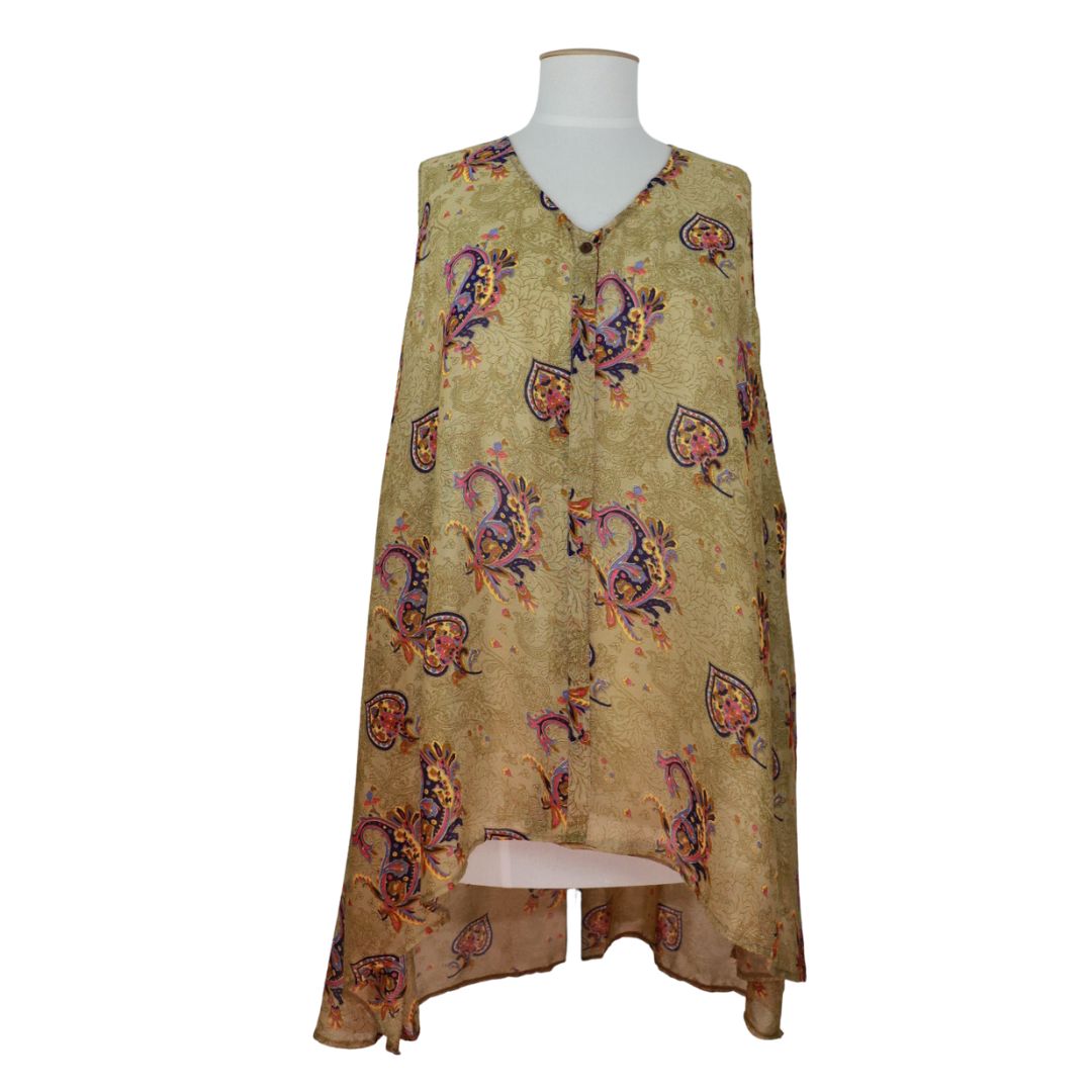 Add colour to your wardrobe with a unique piece to layer with. This sleeveless top / waistcoat has a single button to fasten it allowing the garment to float with you. Made from recycled saris.