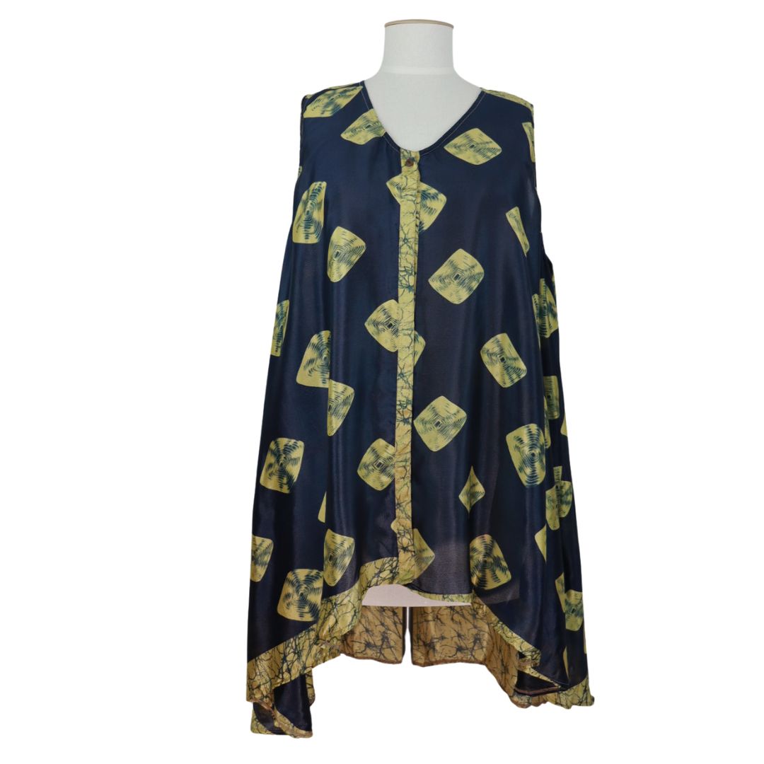 Add colour to your wardrobe with a unique piece to layer with. This sleeveless top / waistcoat has a single button to fasten it allowing the garment to float with you. Made from recycled saris.