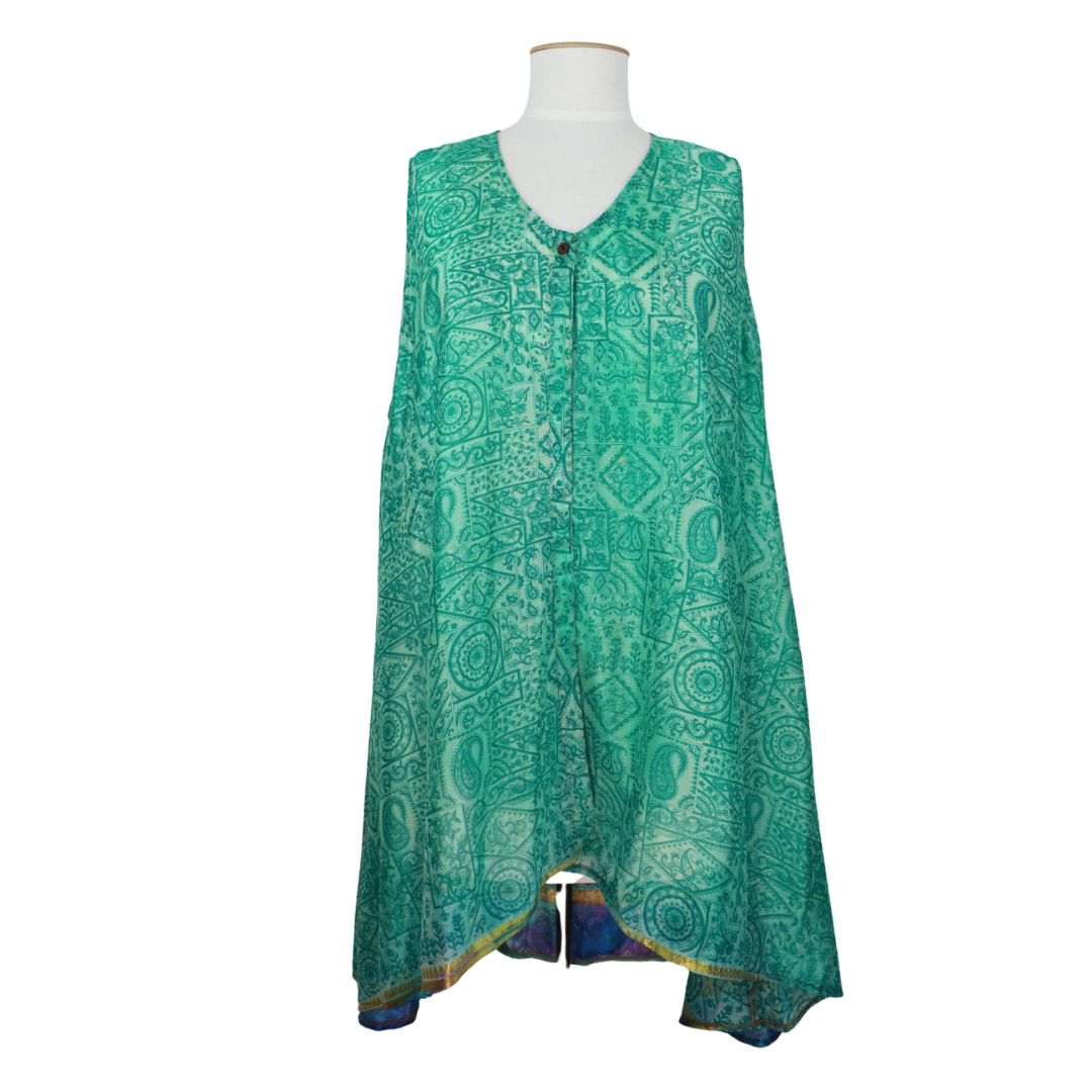 Add colour to your wardrobe with a unique piece to layer with. This sleeveless top / waistcoat has a single button to fasten it allowing the garment to float with you. Made from recycled saris.