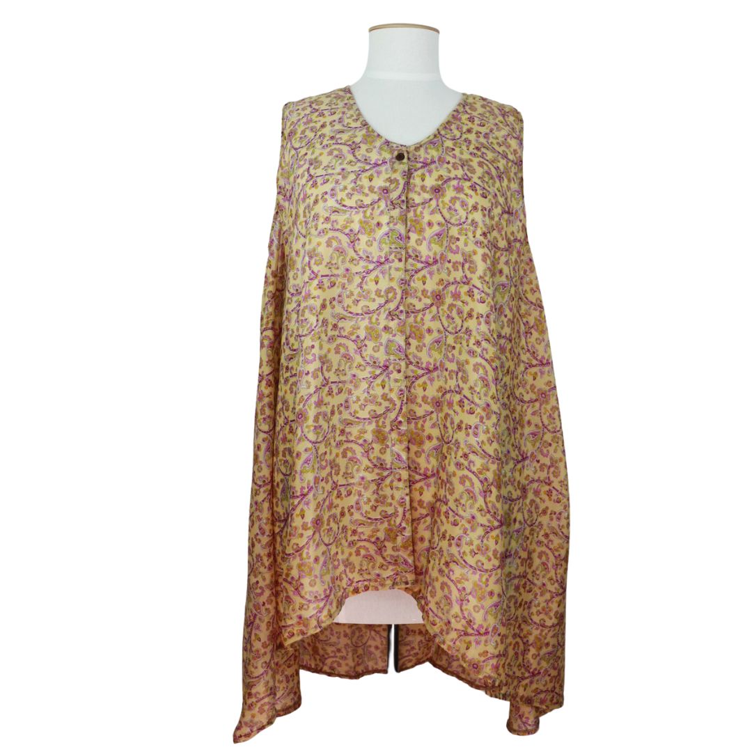 Add colour to your wardrobe with a unique piece to layer with. This sleeveless top / waistcoat has a single button to fasten it allowing the garment to float with you. Made from recycled saris.