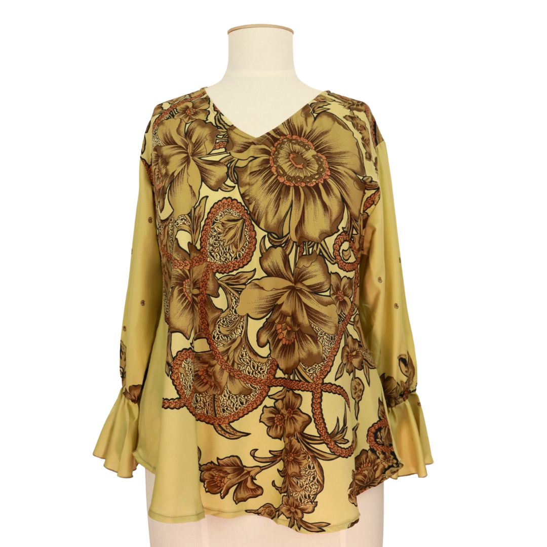This V neck blouse is the same style as our other long sleeve blouses but with the addition of a beautiful and feminine floppy cuff. A single layer of elastic allows the sleeve to be pushed up higher on your forearm for a different look.