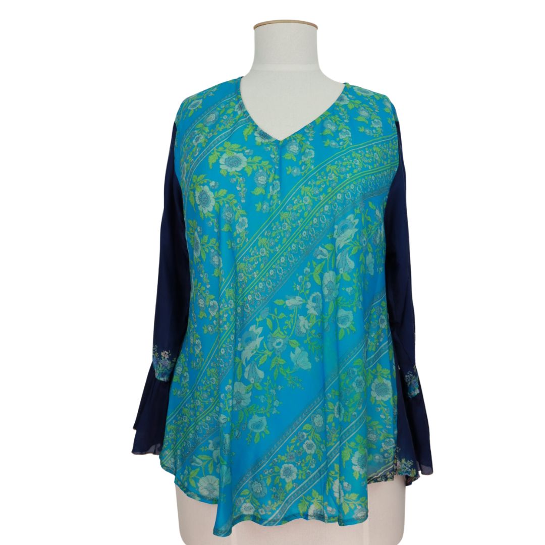 This V neck blouse is the same style as our other long sleeve blouses but with the addition of a beautiful and feminine floppy cuff. A single layer of elastic allows the sleeve to be pushed up higher on your forearm for a different look.