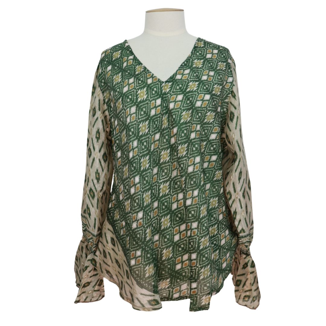 This V neck blouse is the same style as our other long sleeve blouses but with the addition of a beautiful and feminine floppy cuff. A single layer of elastic allows the sleeve to be pushed up higher on your forearm for a different look.