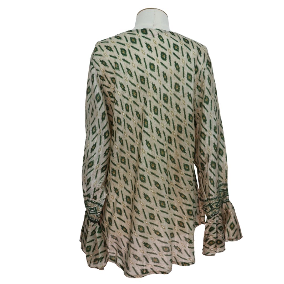 You'll receive this blouse. Since each one is lovingly hand made from an up-cycled silk blend sari, you may find tiny imperfections in the fabric.