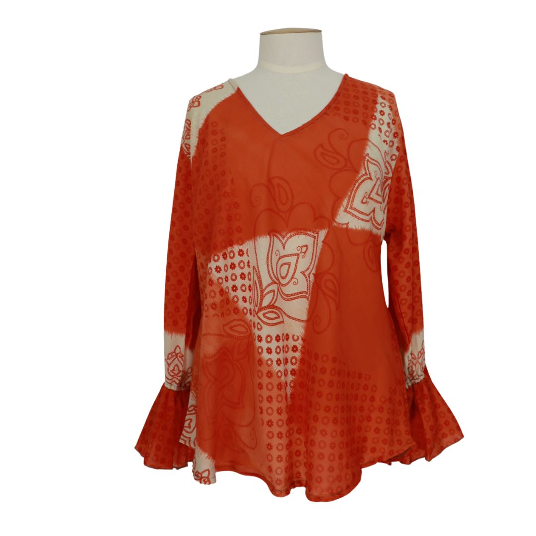 This V neck blouse is the same style as our other long sleeve blouses but with the addition of a beautiful and feminine floppy cuff. A single layer of elastic allows the sleeve to be pushed up higher on your forearm for a different look.