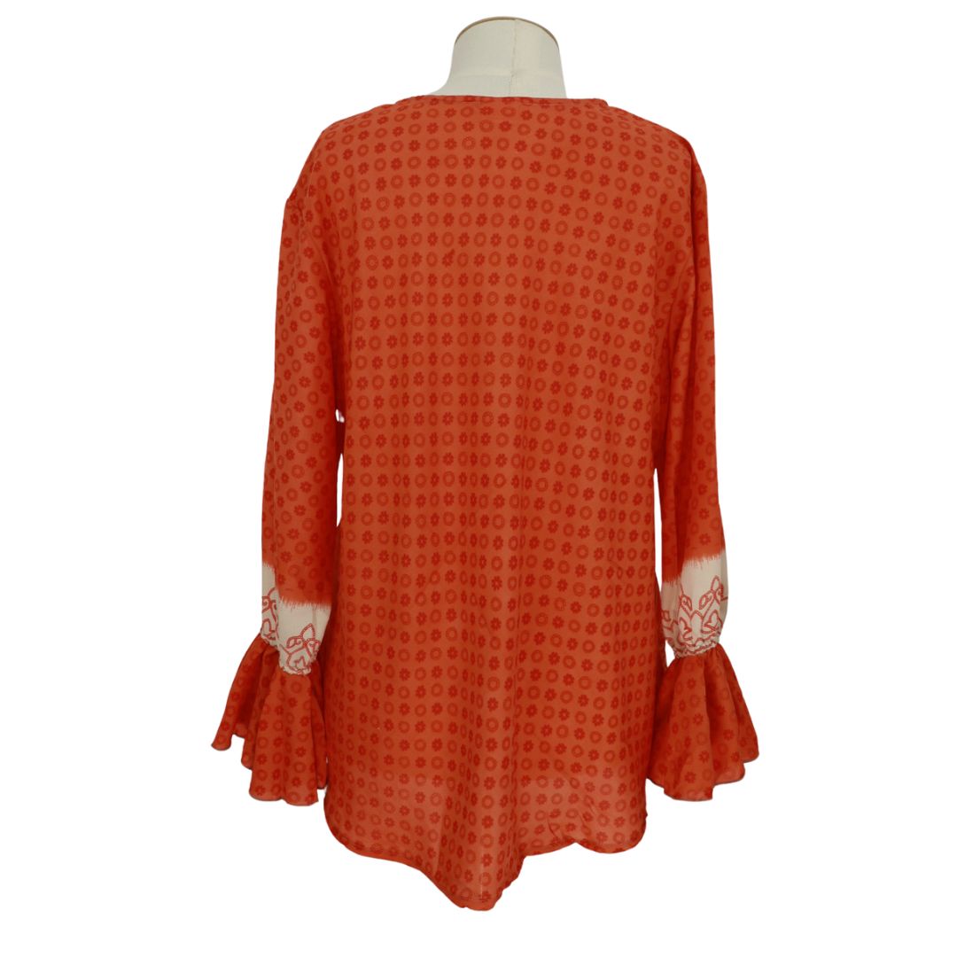 A wonderful colourful top and that does not cling and is very feminine. I went with the size 14 to 16 as I am between 12 and 14 for tops. If you want firm fitting go down a size.