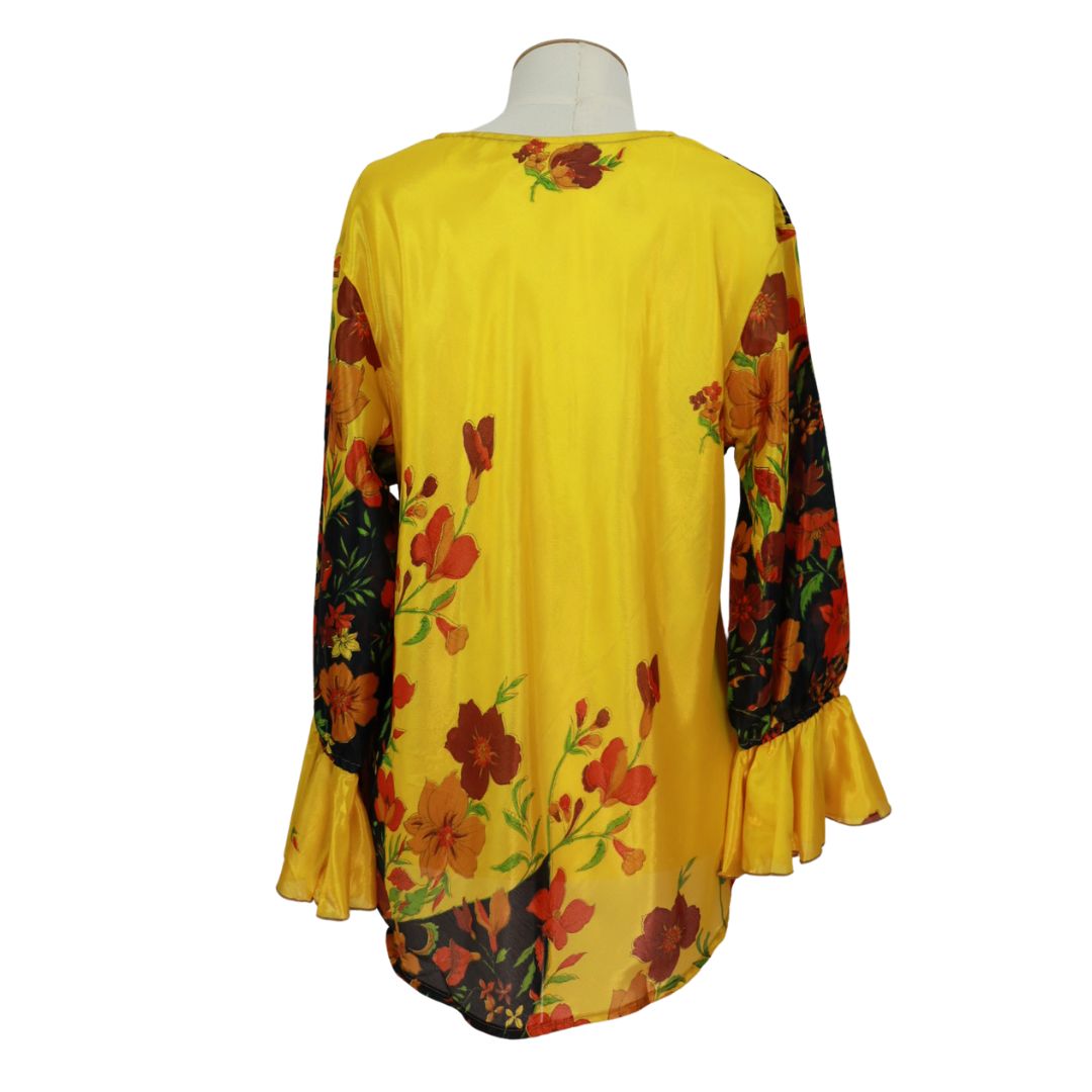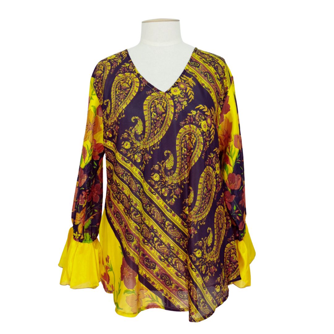 A wonderful colourful top and that does not cling and is very feminine. I went with the size 14 to 16 as I am between 12 and 14 for tops. If you want firm fitting go down a size.