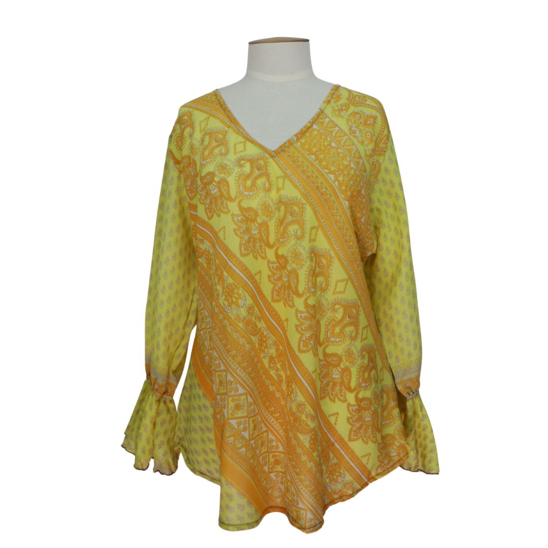 A wonderful colourful top and that does not cling and is very feminine. I went with the size 14 to 16 as I am between 12 and 14 for tops. If you want firm fitting go down a size.