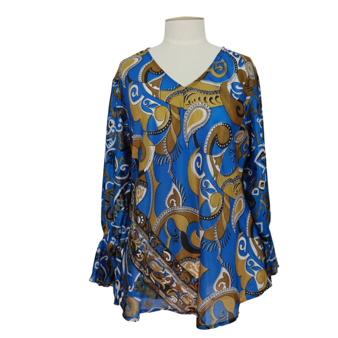 A wonderful colourful top and that does not cling and is very feminine. I went with the size 14 to 16 as I am between 12 and 14 for tops. If you want firm fitting go down a size.