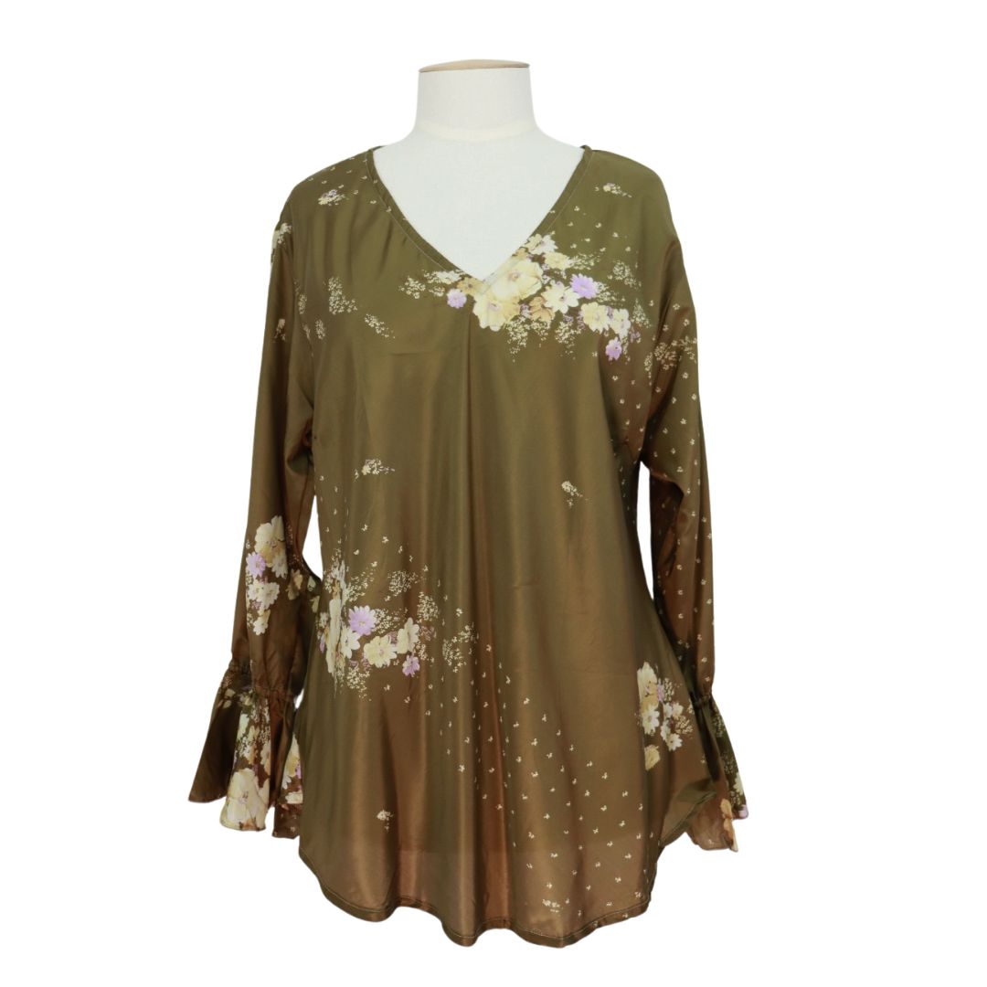 This V neck blouse is the same style as our other long sleeve blouses but with the addition of a beautiful and feminine floppy cuff. A single layer of elastic allows the sleeve to be pushed up higher on your forearm for a different look.