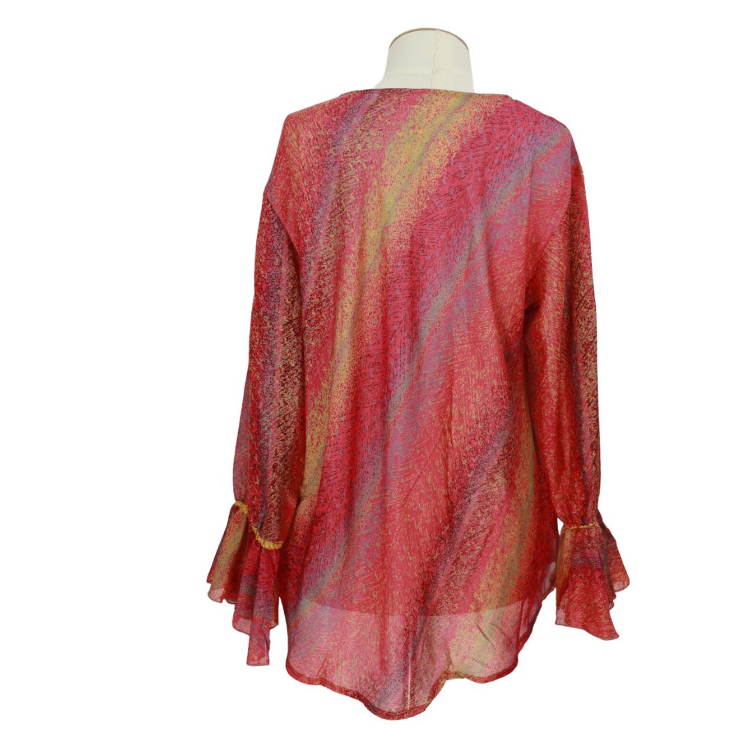A wonderful colourful top and that does not cling and is very feminine. I went with the size 14 to 16 as I am between 12 and 14 for tops. If you want firm fitting go down a size.