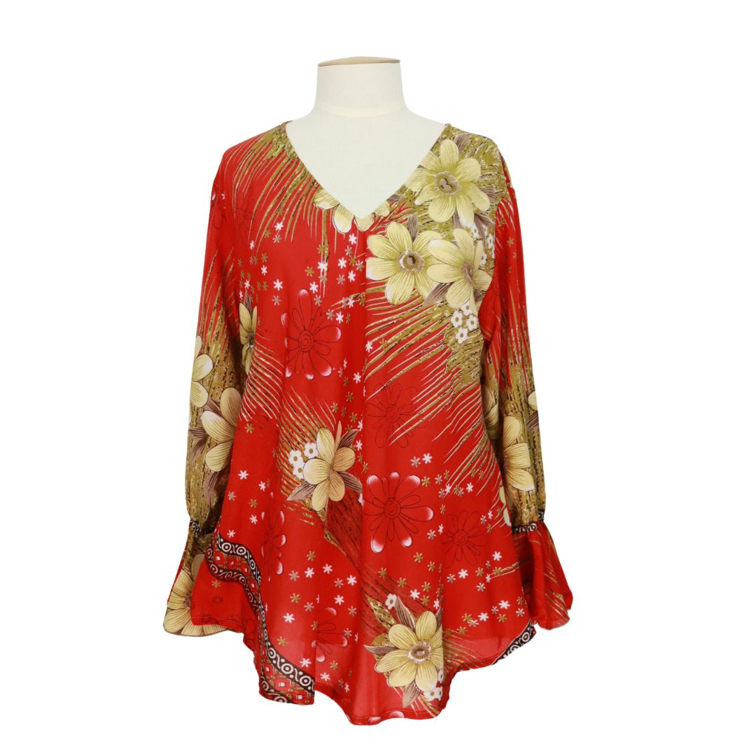 This V neck blouse is the same style as our other long sleeve blouses but with the addition of a beautiful and feminine floppy cuff. A single layer of elastic allows the sleeve to be pushed up higher on your forearm for a different look.