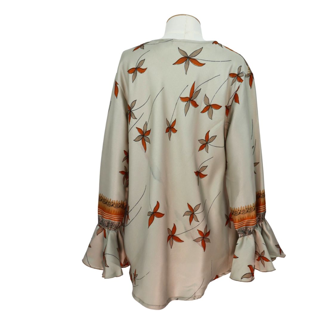 This V neck blouse is the same style as our other long sleeve blouses but with the addition of a beautiful and feminine floppy cuff. A single layer of elastic allows the sleeve to be pushed up higher on your forearm for a different look.
