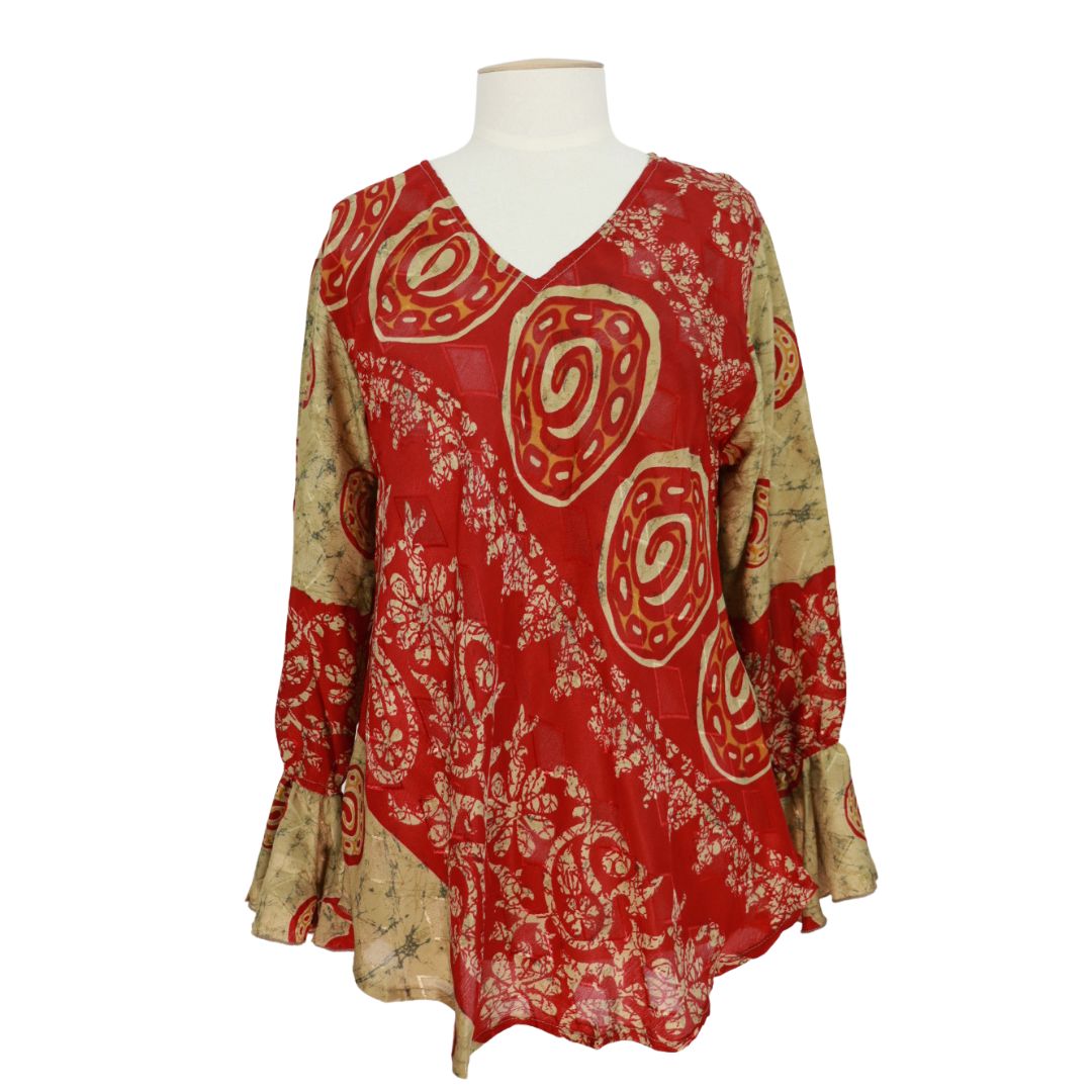 This V neck blouse is the same style as our other long sleeve blouses but with the addition of a beautiful and feminine floppy cuff. A single layer of elastic allows the sleeve to be pushed up higher on your forearm for a different look.