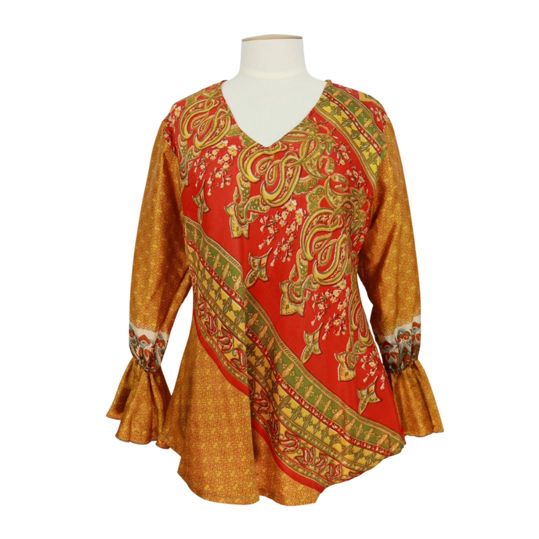 This V neck blouse is the same style as our other long sleeve blouses but with the addition of a beautiful and feminine floppy cuff. A single layer of elastic allows the sleeve to be pushed up higher on your forearm for a different look.