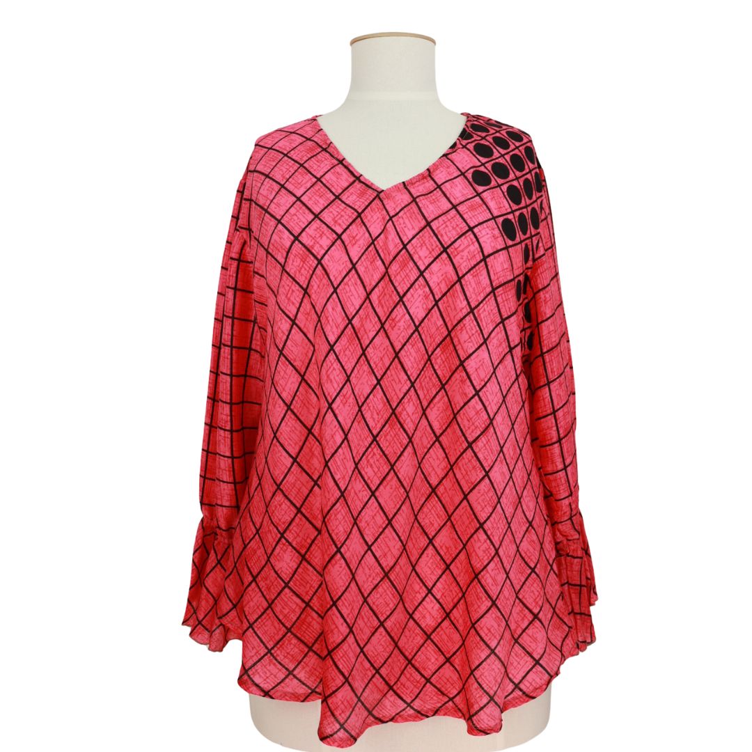 This V neck blouse is the same style as our other long sleeve blouses but with the addition of a beautiful and feminine floppy cuff. A single layer of elastic allows the sleeve to be pushed up higher on your forearm for a different look.