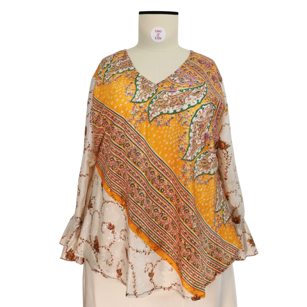 You'll receive this blouse. Since each one is lovingly hand made from an up-cycled silk blend sari, you may find tiny imperfections in the fabric.