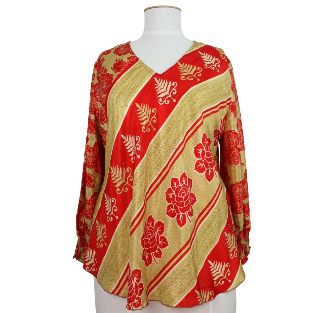 You'll receive this blouse. Since each one is lovingly hand made from an up-cycled silk blend sari, you may find tiny imperfections in the fabric. Occasionally an artisan may place a sequin or other small replica jewels over an imperfection.