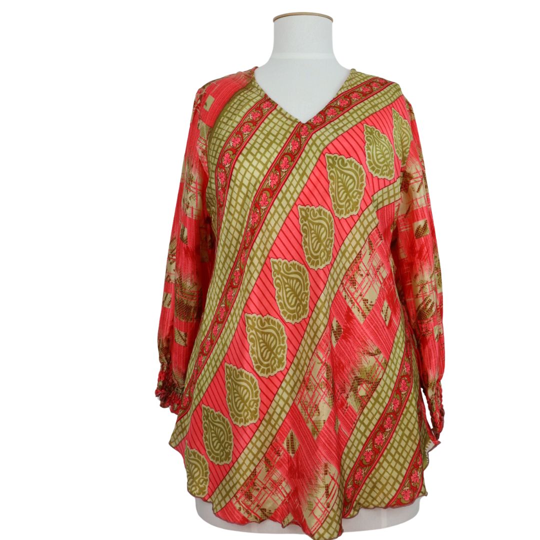 A wonderful colourful top and that does not cling and is very feminine. I went with the size 14 to 16 as I am between 12 and 14 for tops. If you want firm fitting go down a size.