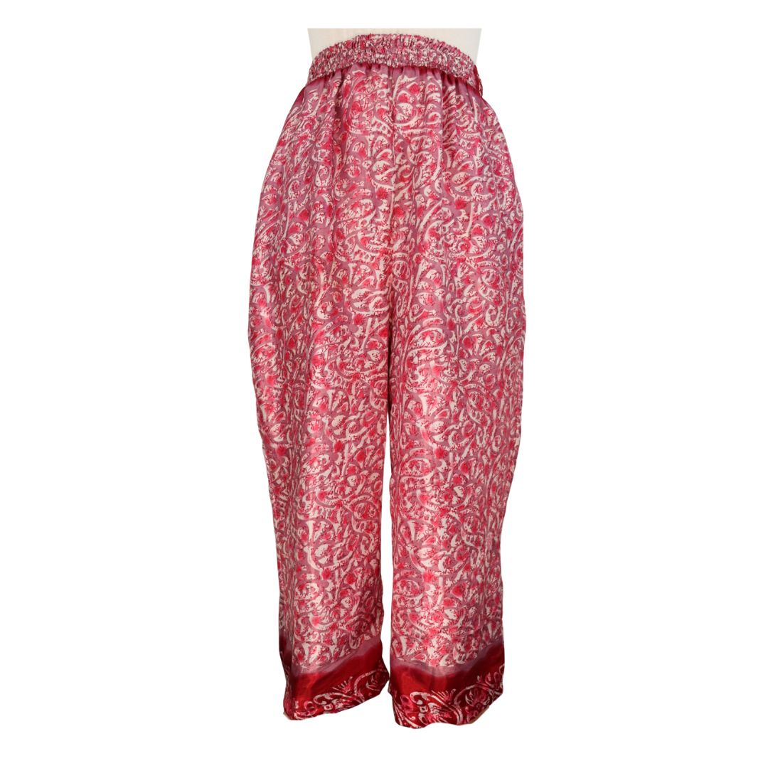 Traditionally Saris are often flamboyant and brightly coloured, frequently embroidered, and made from silk, cotton, or, in recent years, synthetic cloth such as viscose and polyester. We use retro Sari cloth in the majority of our garments so silk is a high component. It is not uncommon to find chiffon or georgette added into the mix which is why we refer to the skirts as a silk blend. We also use 'end of roll' sari fabrics.