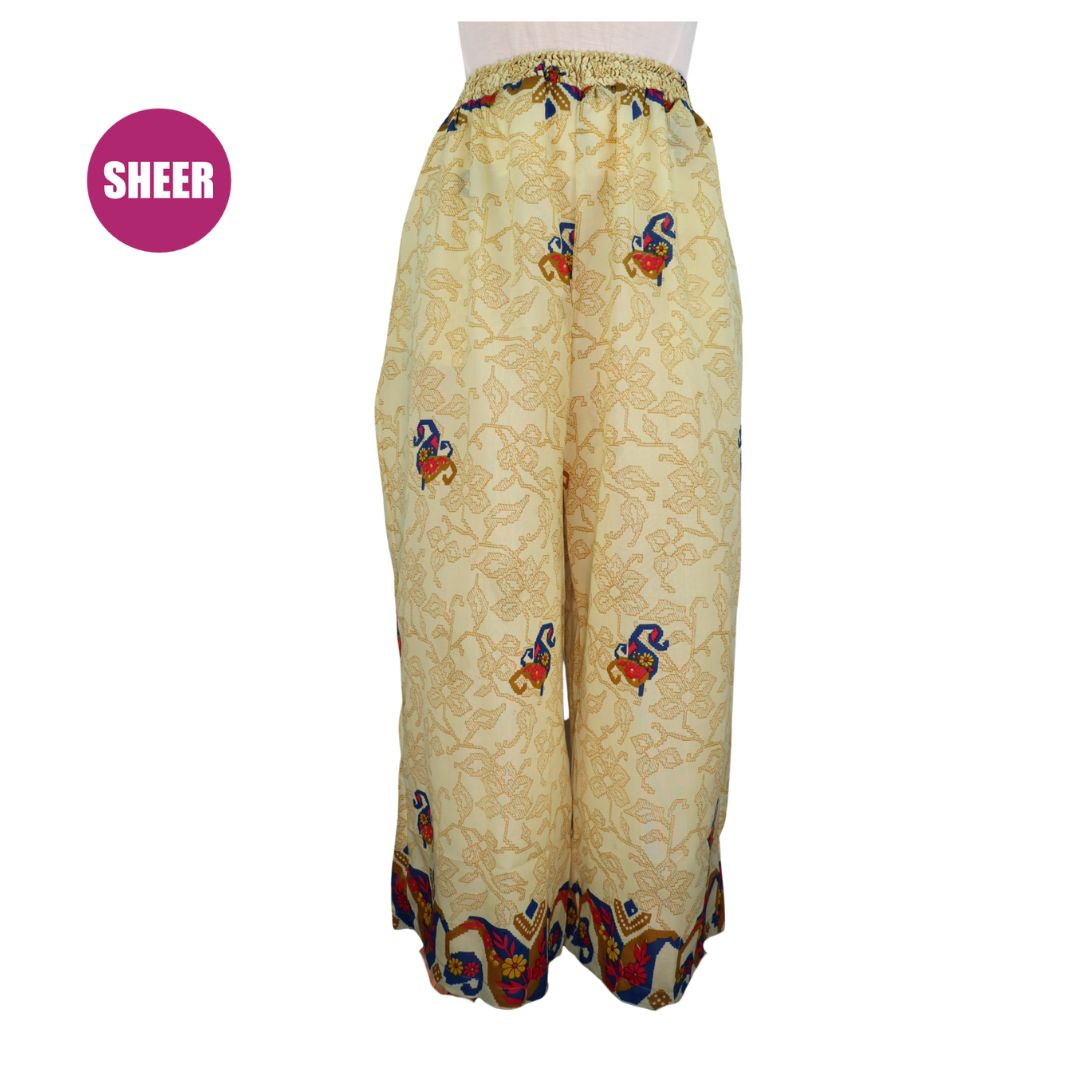 Traditionally Saris are often flamboyant and brightly coloured, frequently embroidered, and made from silk, cotton, or, in recent years, synthetic cloth such as viscose and polyester. We use retro Sari cloth in the majority of our garments so silk is a high component. It is not uncommon to find chiffon or georgette added into the mix which is why we refer to the skirts as a silk blend. We also use 'end of roll' sari fabrics.