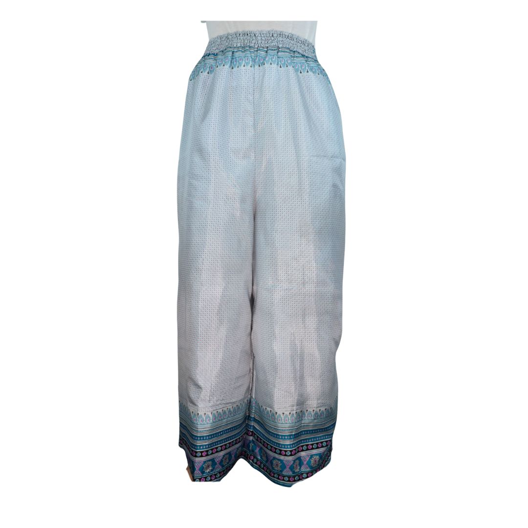 Traditionally Saris are often flamboyant and brightly coloured, frequently embroidered, and made from silk, cotton, or, in recent years, synthetic cloth such as viscose and polyester. We use retro Sari cloth in the majority of our garments so silk is a high component. It is not uncommon to find chiffon or georgette added into the mix which is why we refer to the skirts as a silk blend. We also use 'end of roll' sari fabrics.