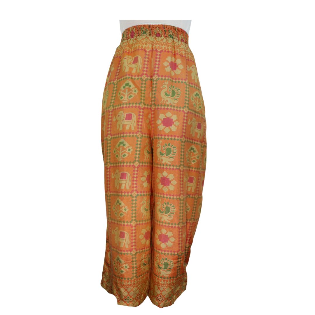 Traditionally Saris are often flamboyant and brightly coloured, frequently embroidered, and made from silk, cotton, or, in recent years, synthetic cloth such as viscose and polyester. We use retro Sari cloth in the majority of our garments so silk is a high component. It is not uncommon to find chiffon or georgette added into the mix which is why we refer to the skirts as a silk blend. We also use 'end of roll' sari fabrics.