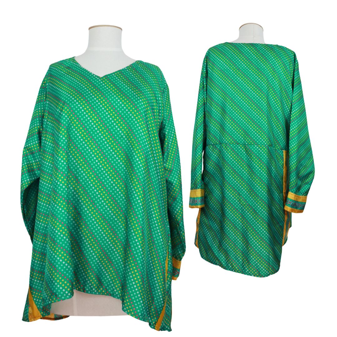You'll receive this garment. Since each one is lovingly hand made from an up-cycled silk blend sari, you may find tiny imperfections in the fabric.