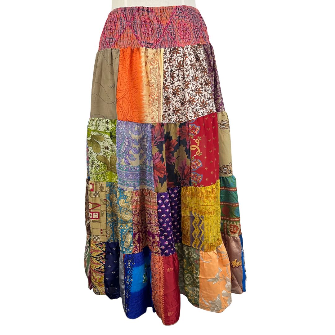 Traditionally Saris are often flamboyant and brightly coloured, frequently embroidered, and made from silk, cotton, or, in recent years, synthetic cloth such as viscose and polyester. We use retro Sari cloth in the majority of our garments so silk is a high component. It is not uncommon to find chiffon or georgette added into the mix which is why we refer to the skirts as a silk blend. We also use 'end of roll' sari fabrics.