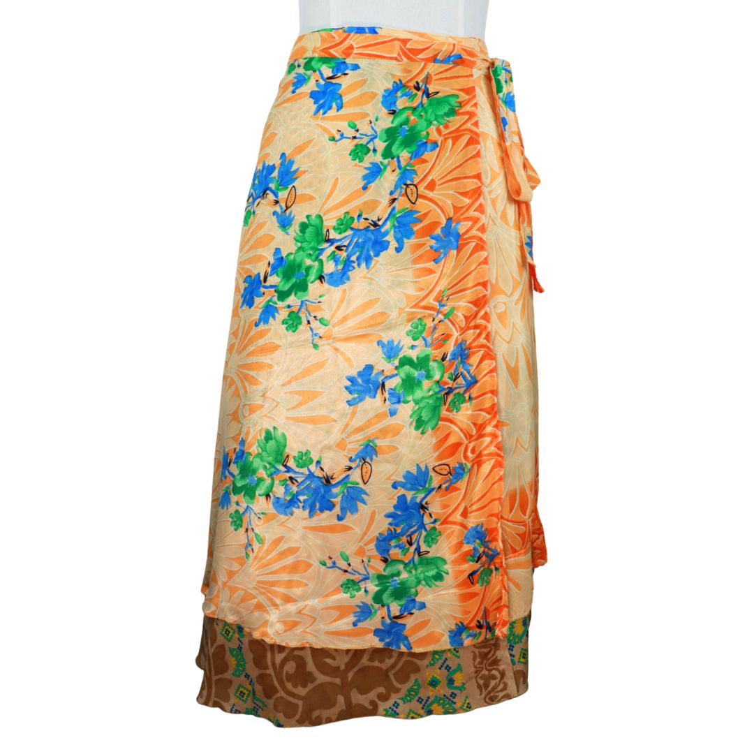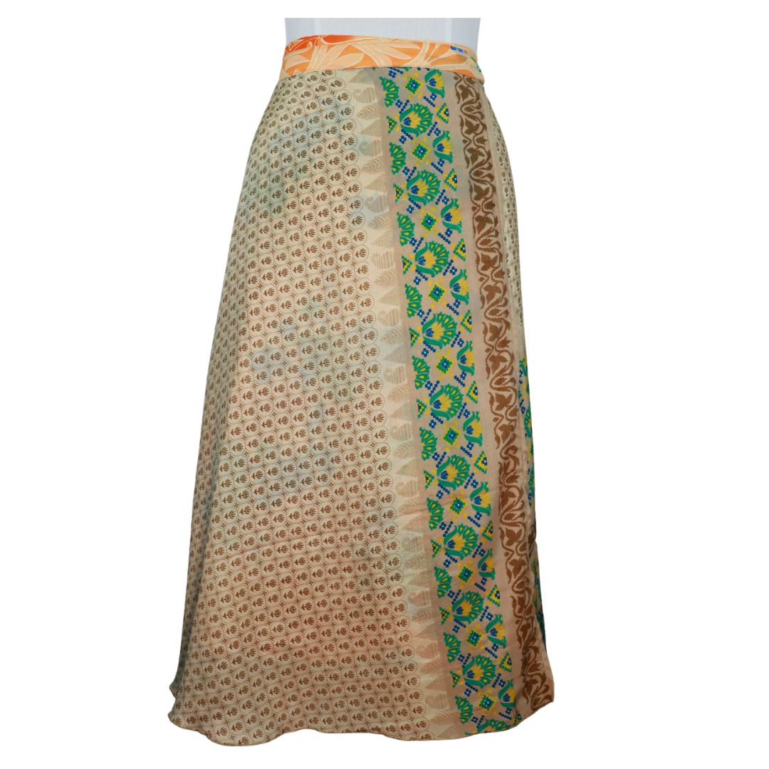 Traditionally Saris are often flamboyant and brightly coloured, frequently embroidered, and made from silk, cotton, or, in recent years, synthetic cloth such as viscose and polyester. We use retro Sari cloth in the majority of our garments so silk is a high component. It is not uncommon to find chiffon or georgette added into the mix which is why we refer to the skirts as a silk blend. We also use 'end of roll' sari fabrics.