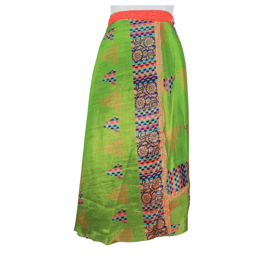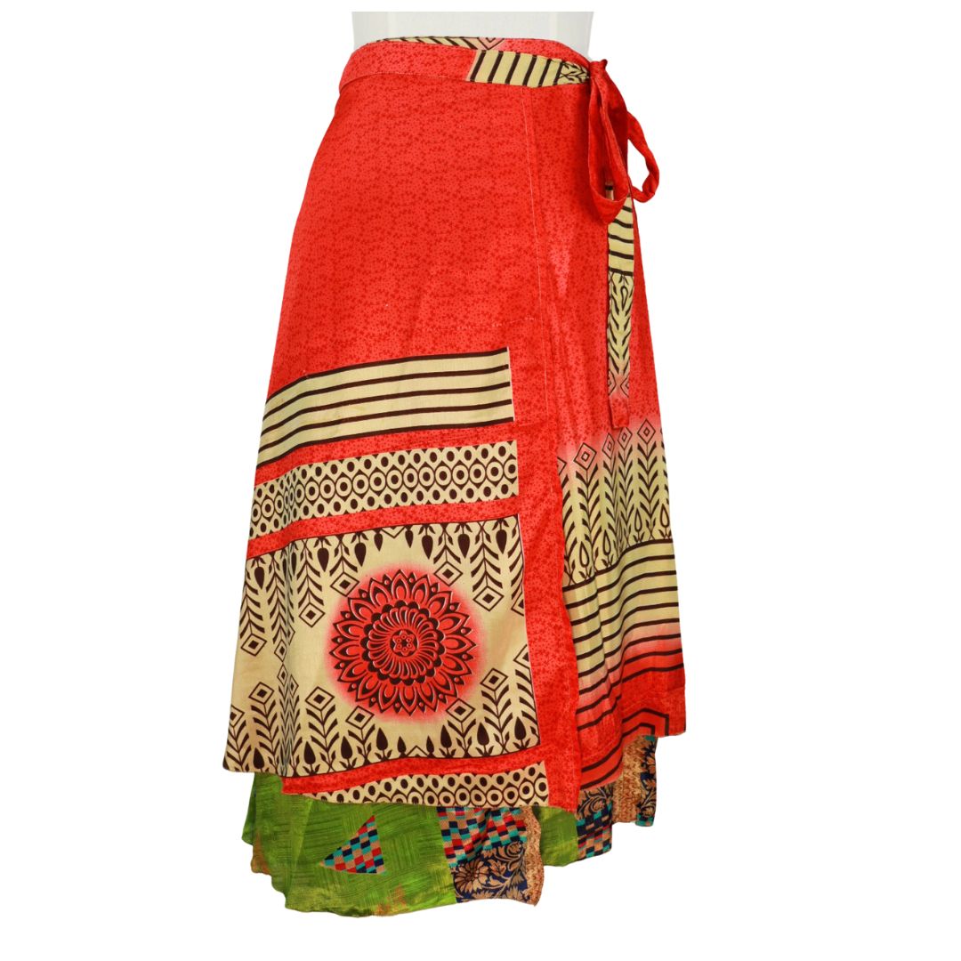 Traditionally Saris are often flamboyant and brightly coloured, frequently embroidered, and made from silk, cotton, or, in recent years, synthetic cloth such as viscose and polyester. We use retro Sari cloth in the majority of our garments so silk is a high component. It is not uncommon to find chiffon or georgette added into the mix which is why we refer to the skirts as a silk blend. We also use 'end of roll' sari fabrics.