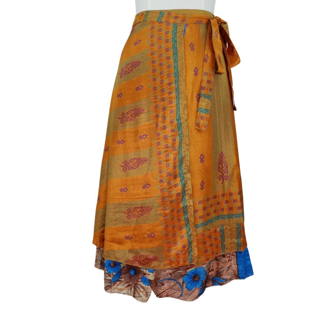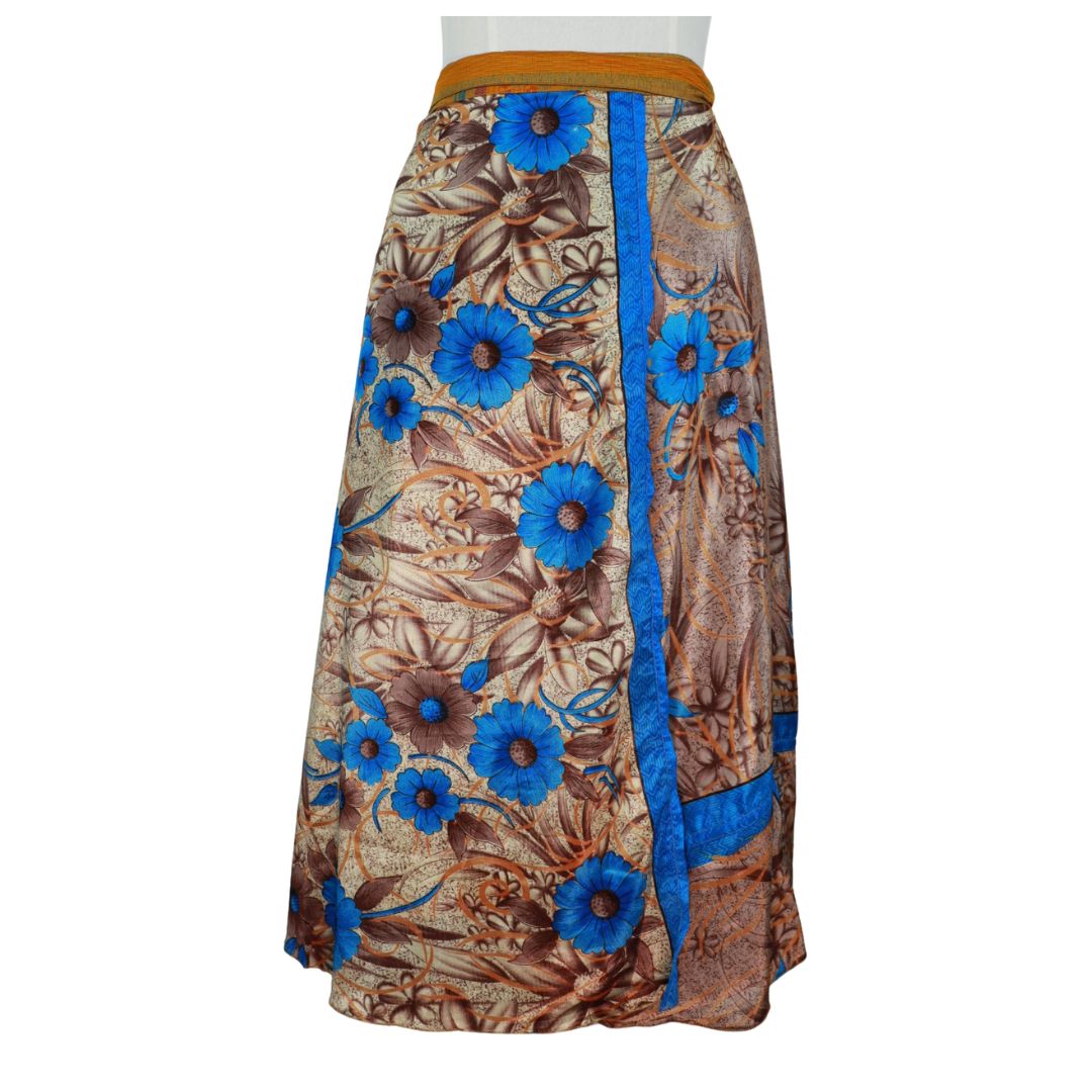 Traditionally Saris are often flamboyant and brightly coloured, frequently embroidered, and made from silk, cotton, or, in recent years, synthetic cloth such as viscose and polyester. We use retro Sari cloth in the majority of our garments so silk is a high component. It is not uncommon to find chiffon or georgette added into the mix which is why we refer to the skirts as a silk blend. We also use 'end of roll' sari fabrics.