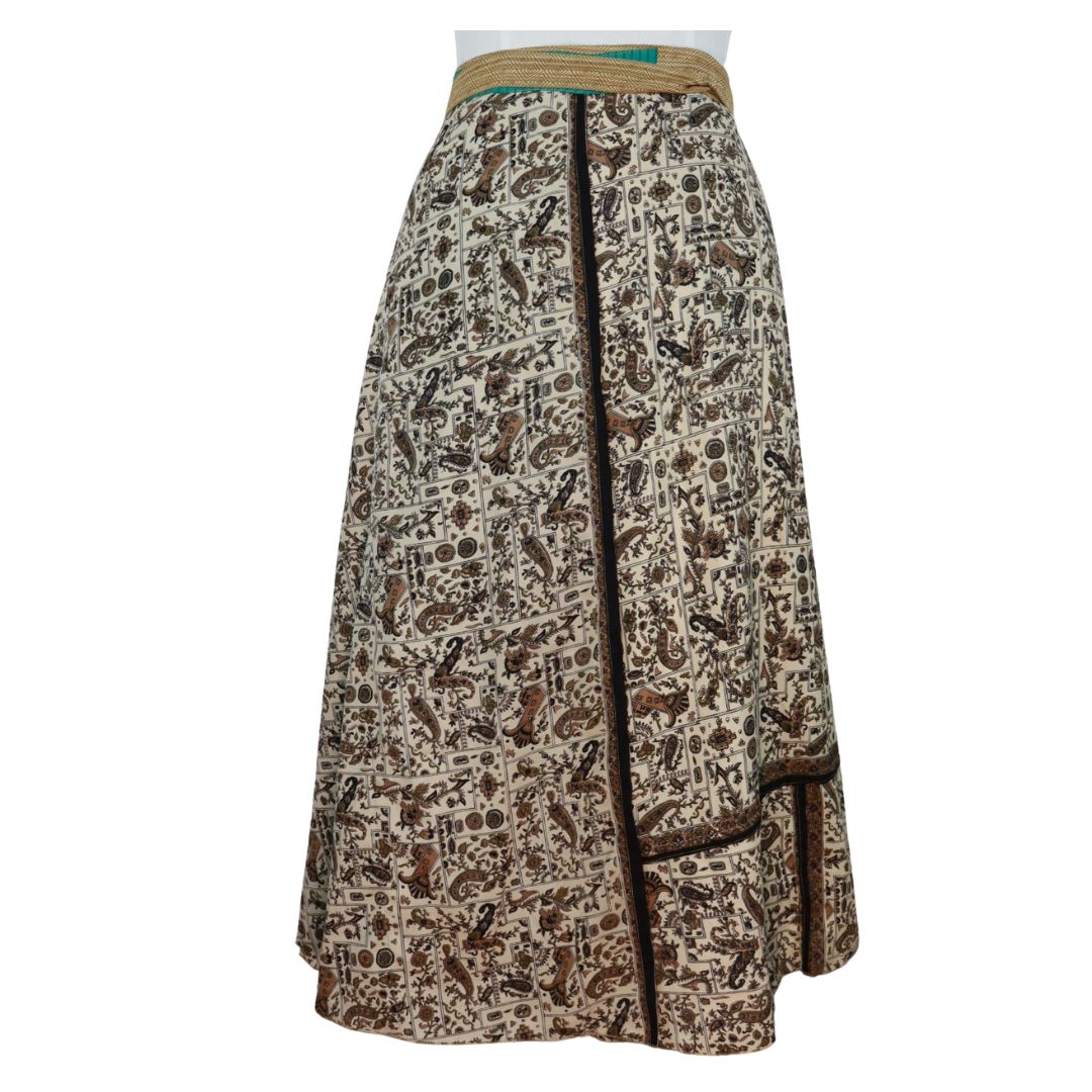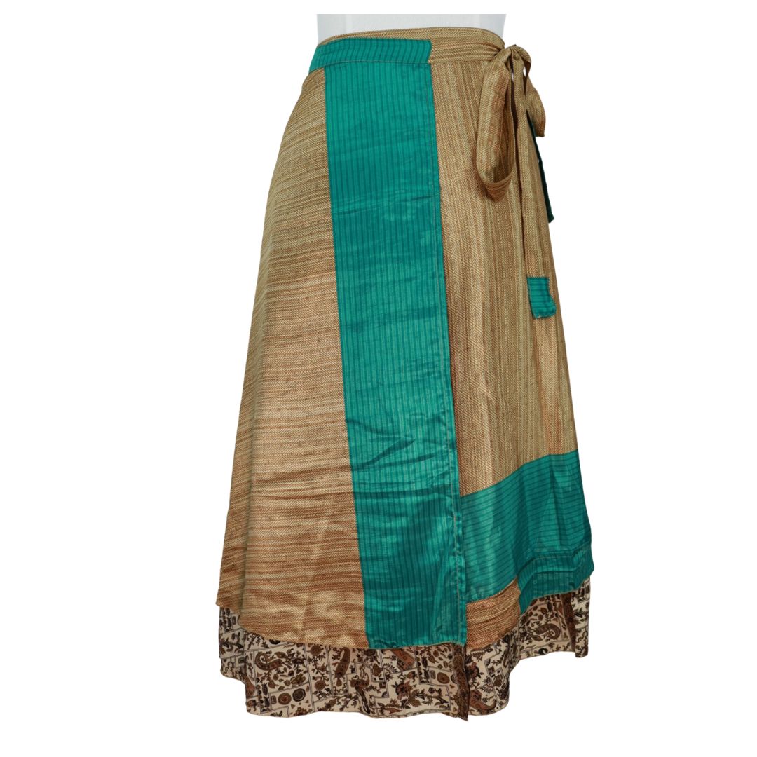Traditionally Saris are often flamboyant and brightly coloured, frequently embroidered, and made from silk, cotton, or, in recent years, synthetic cloth such as viscose and polyester. We use retro Sari cloth in the majority of our garments so silk is a high component. It is not uncommon to find chiffon or georgette added into the mix which is why we refer to the skirts as a silk blend. We also use 'end of roll' sari fabrics.
