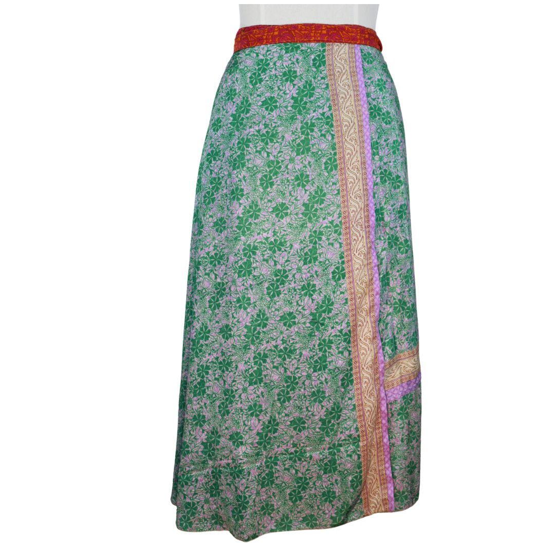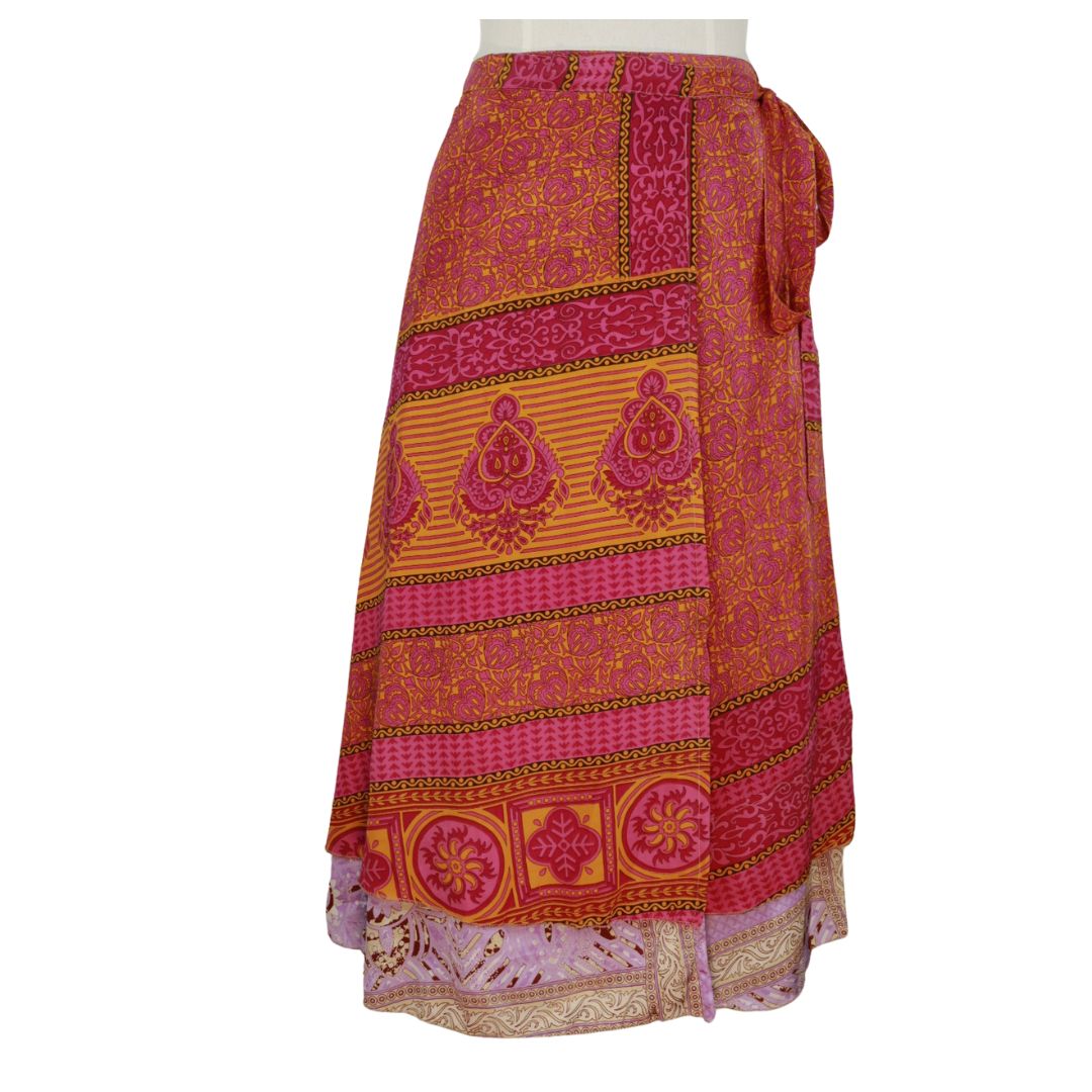 Traditionally Saris are often flamboyant and brightly coloured, frequently embroidered, and made from silk, cotton, or, in recent years, synthetic cloth such as viscose and polyester. We use retro Sari cloth in the majority of our garments so silk is a high component. It is not uncommon to find chiffon or georgette added into the mix which is why we refer to the skirts as a silk blend. We also use 'end of roll' sari fabrics.