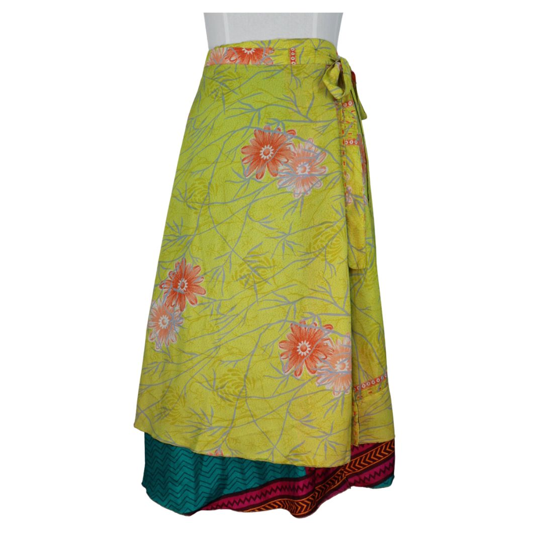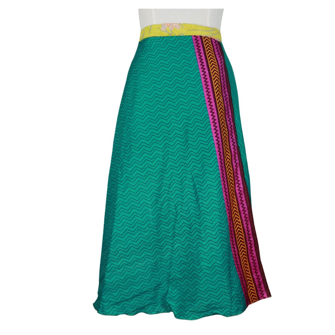 Traditionally Saris are often flamboyant and brightly coloured, frequently embroidered, and made from silk, cotton, or, in recent years, synthetic cloth such as viscose and polyester. We use retro Sari cloth in the majority of our garments so silk is a high component. It is not uncommon to find chiffon or georgette added into the mix which is why we refer to the skirts as a silk blend. We also use 'end of roll' sari fabrics.