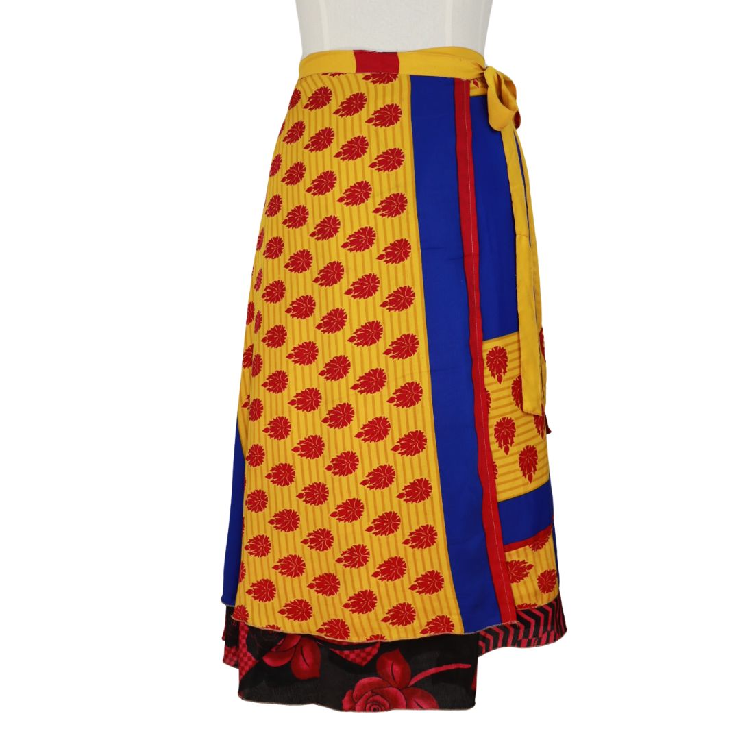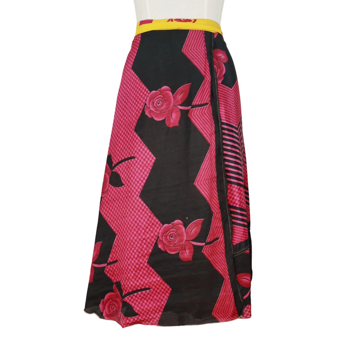 Traditionally Saris are often flamboyant and brightly coloured, frequently embroidered, and made from silk, cotton, or, in recent years, synthetic cloth such as viscose and polyester. We use retro Sari cloth in the majority of our garments so silk is a high component. It is not uncommon to find chiffon or georgette added into the mix which is why we refer to the skirts as a silk blend. We also use 'end of roll' sari fabrics.